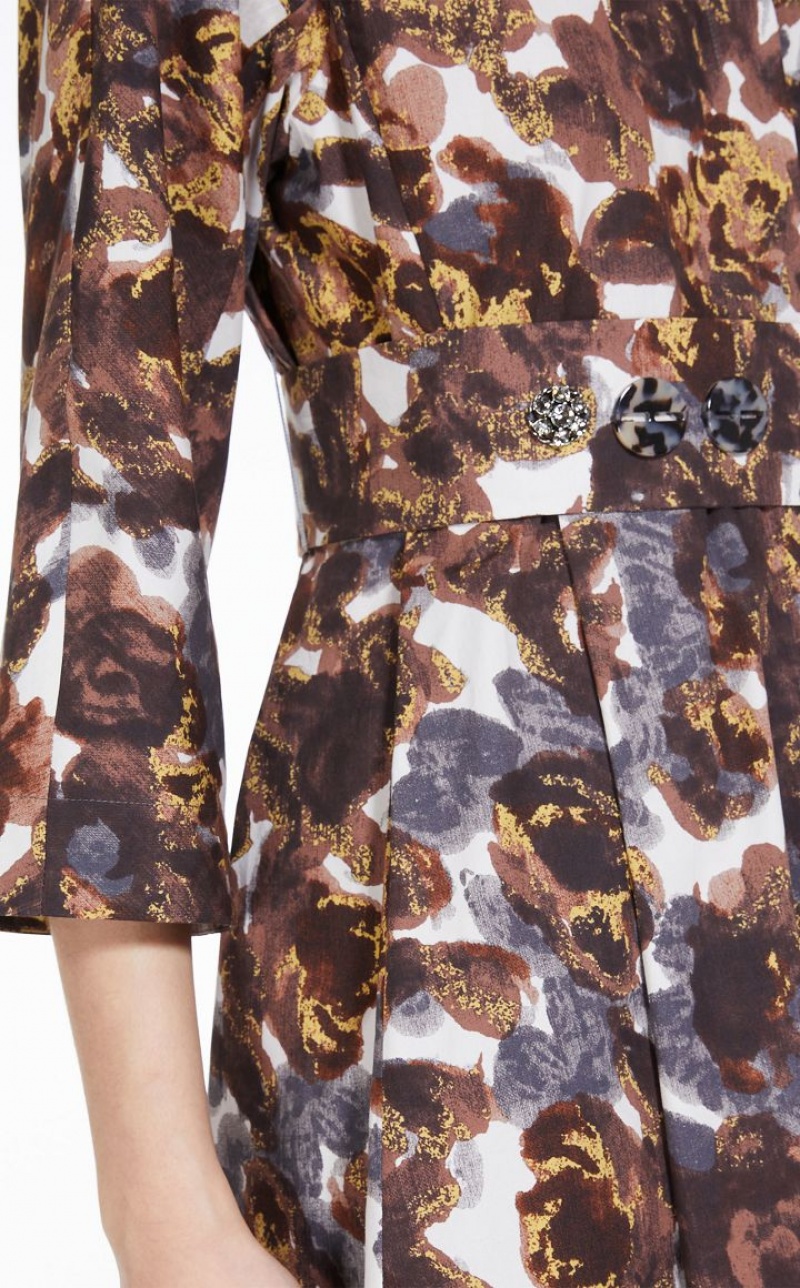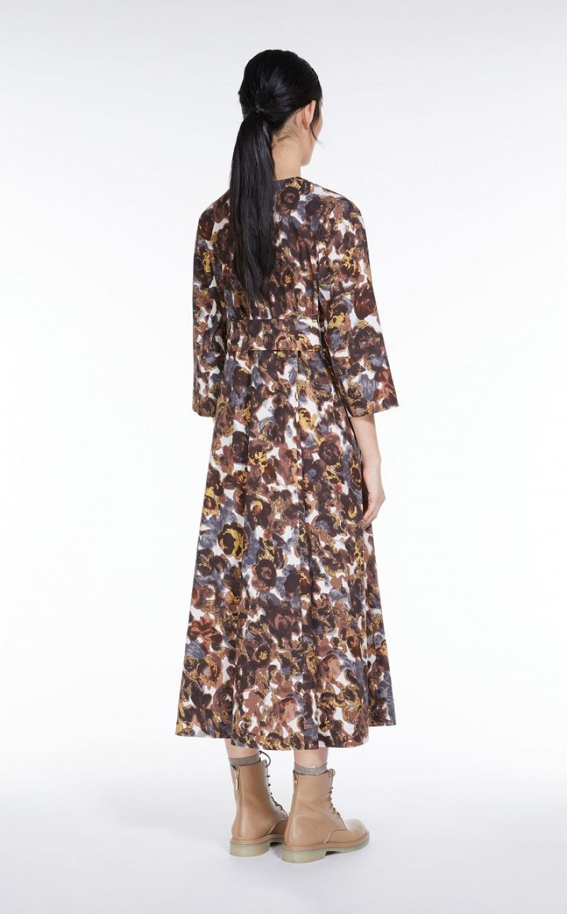 Long flared dress in printed pure cotton poplin fabric featuring a pleated skirt, V-neckline and kimono sleeves. Waistline-accentuating matching embroidered belt. Front zip. Length: 124 cm.