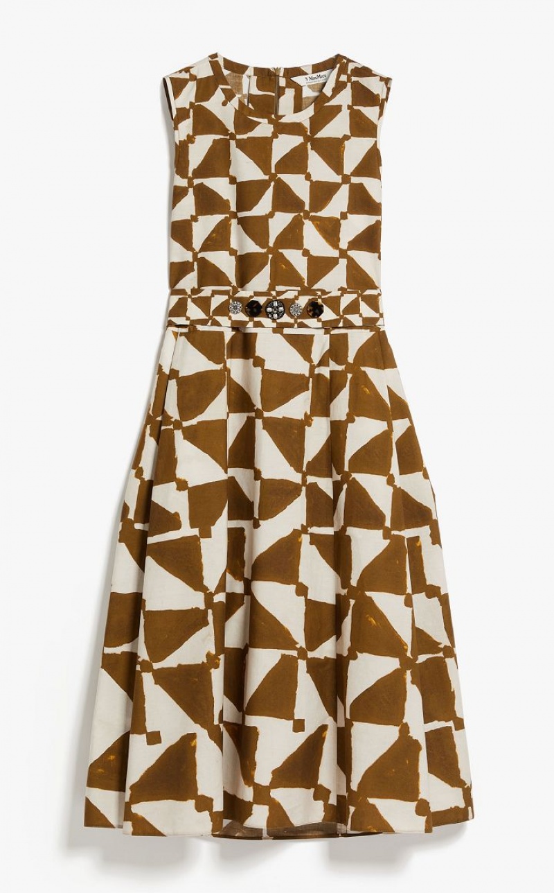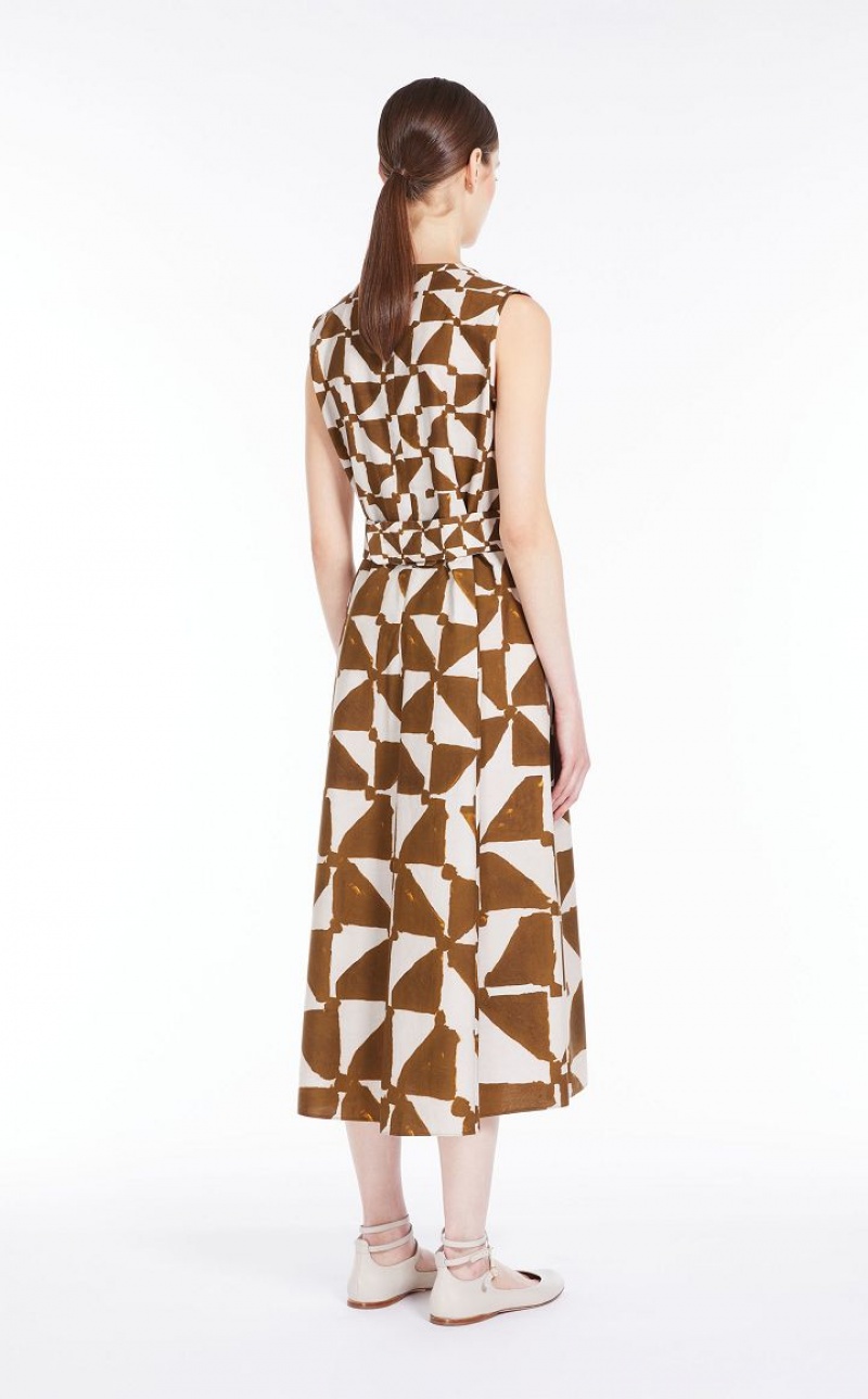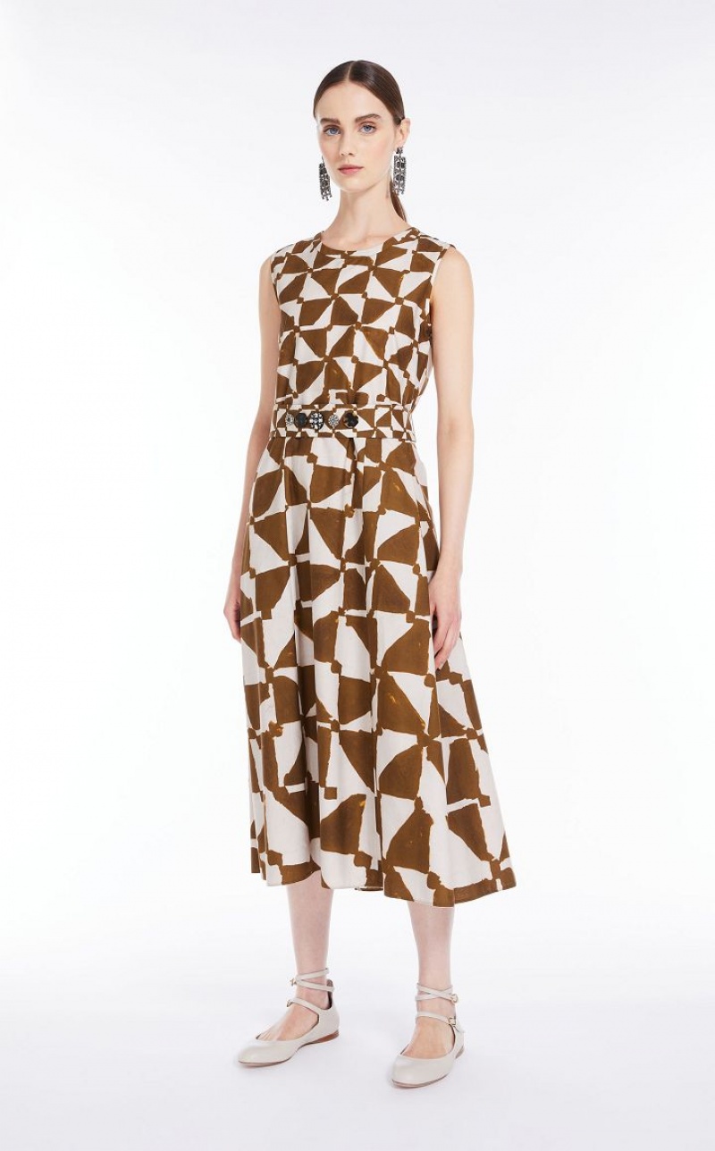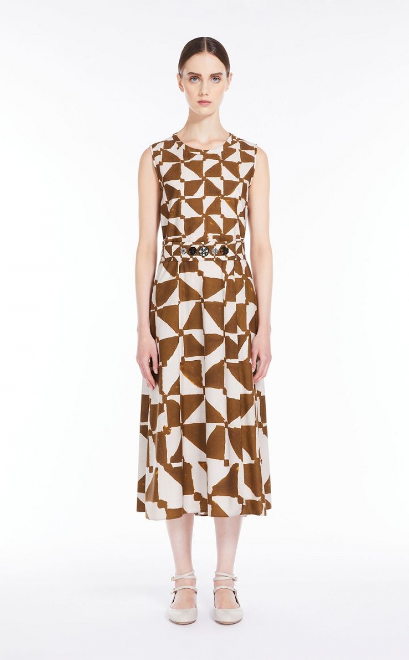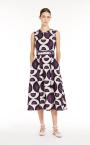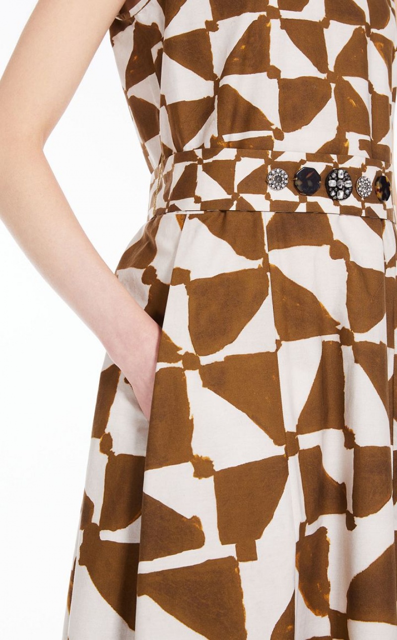 Long sleeveless dress in pure cotton poplin fabric featuring an exclusive-patterned placed print, designed specifically for the model in question. The flared model boasts a full pleated skirt, embroidery-embellished matching belt and a press-stud fastening. Length: 124 cm.