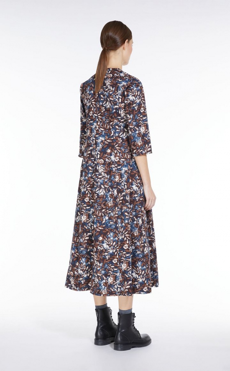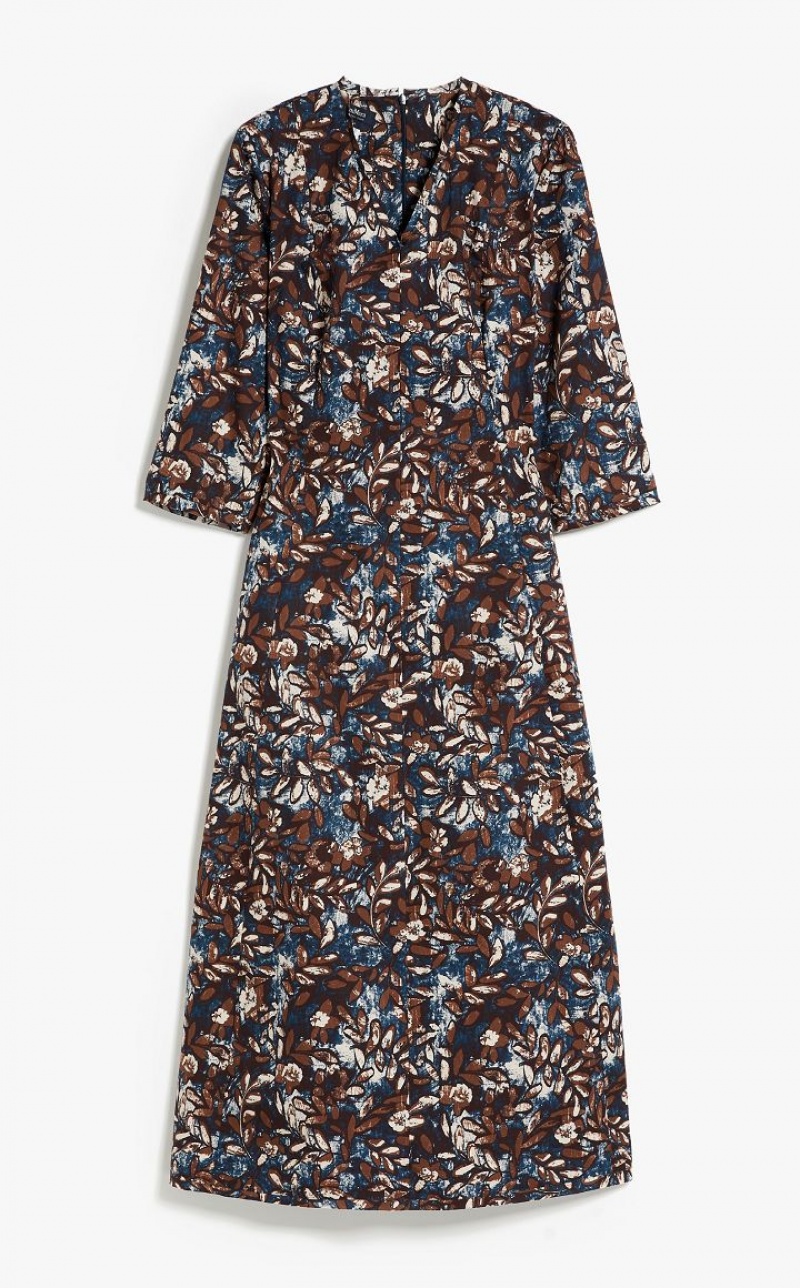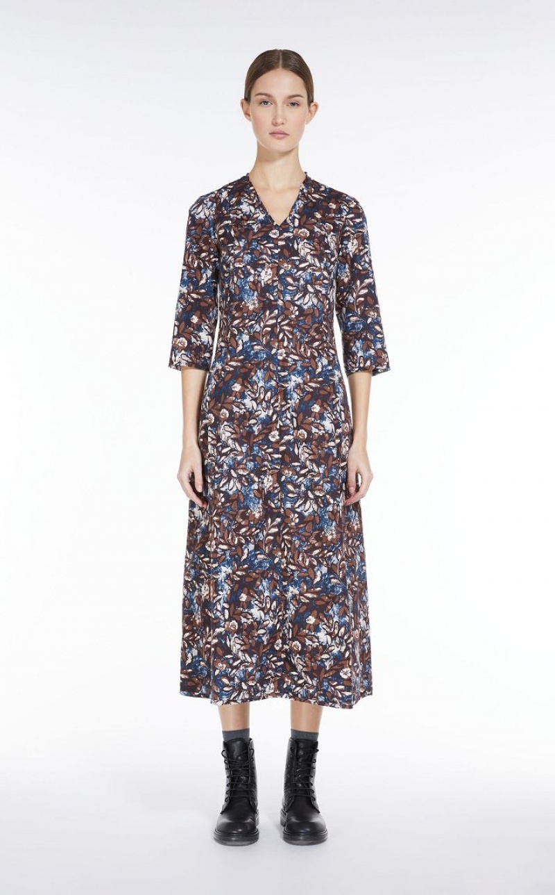 Long dress in printed stretch cotton poplin fabric featuring a slim-fit bodice and flared skirt. Embellished with a V-neckline, 3/ 4 sleeves and in-seam side pockets. Length: 126 cm.