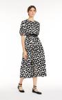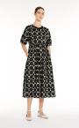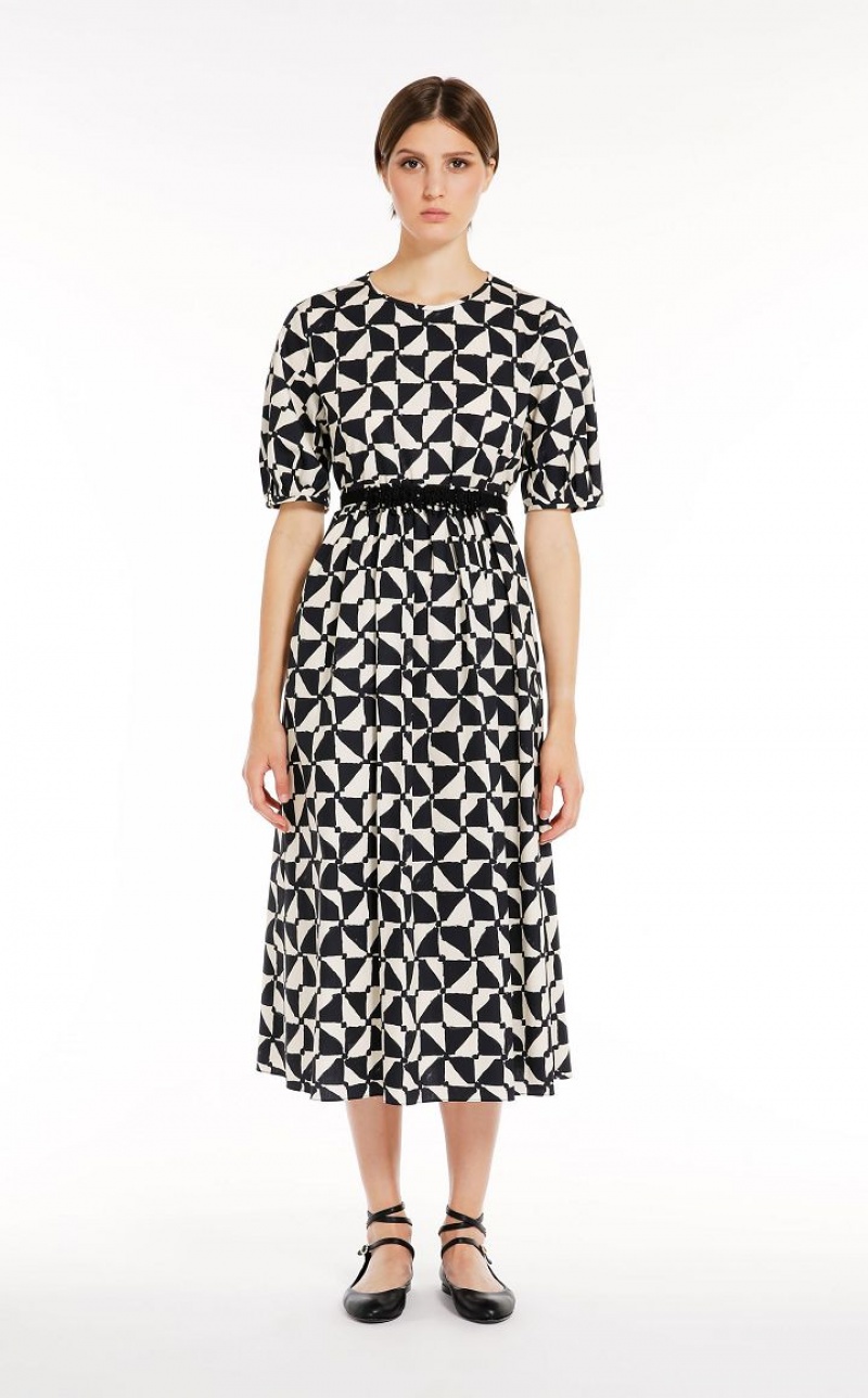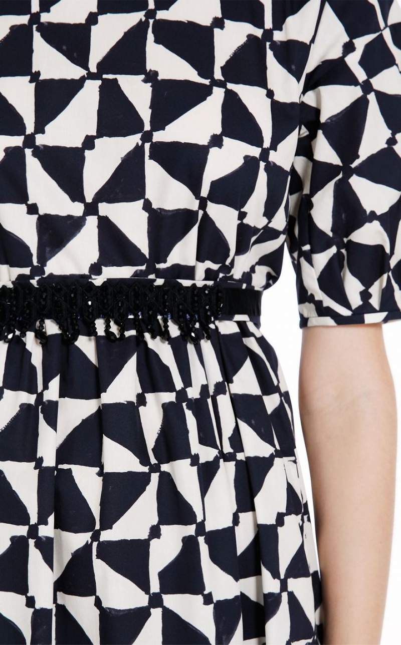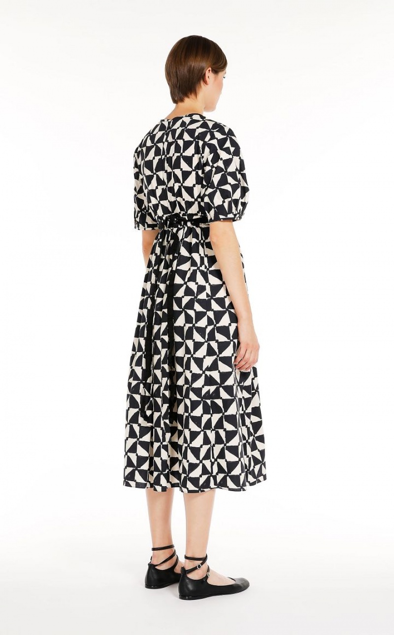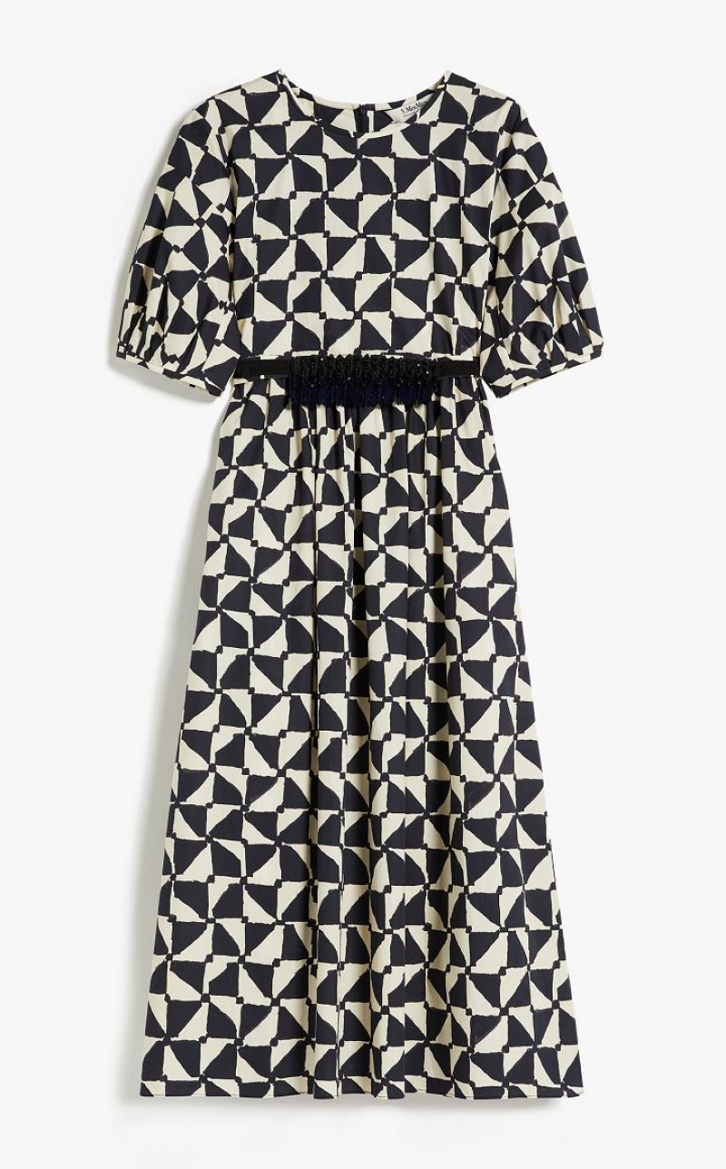 Long crew-neck dress in printed pure cotton poplin fabric featuring short balloon sleeves and a flared skirt. The matching belt is embellished with a removable raffia fringe and black jet embroidery. Length: 121 cm.