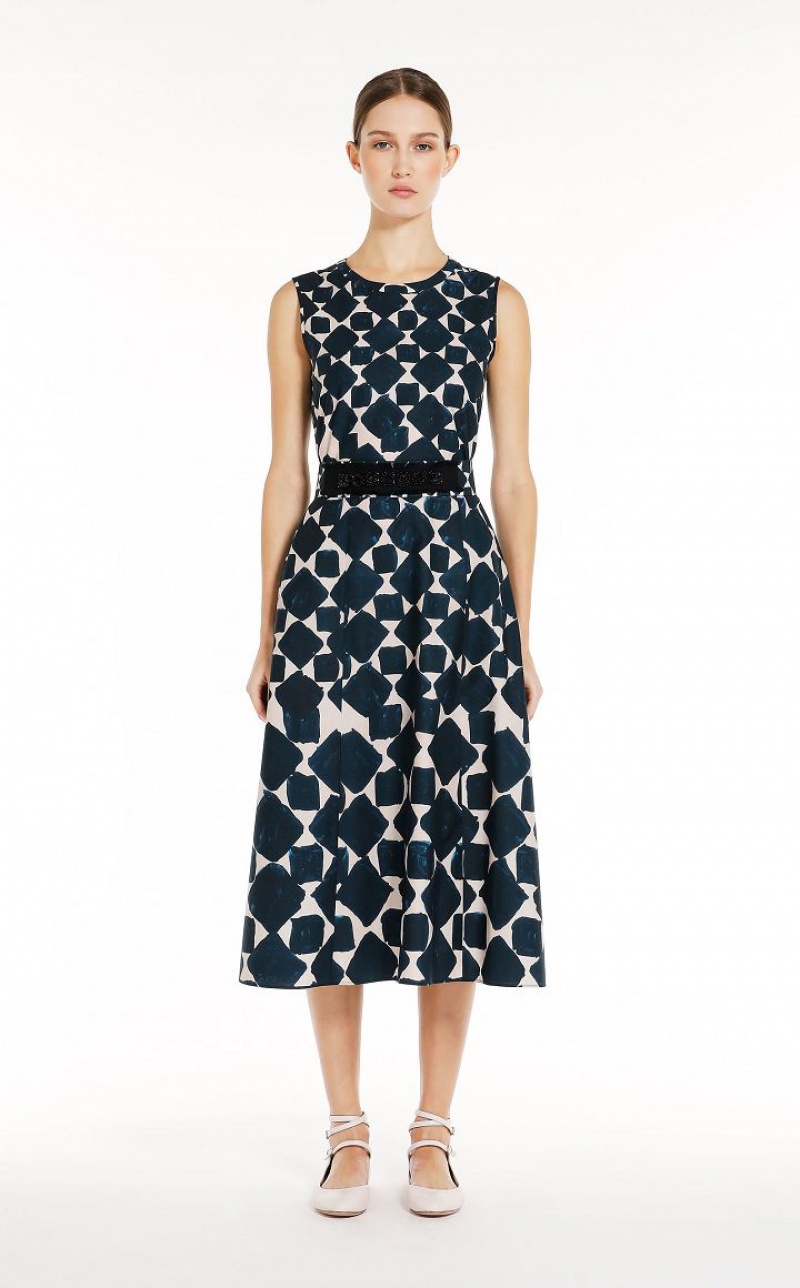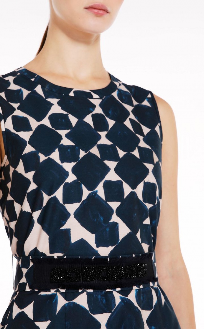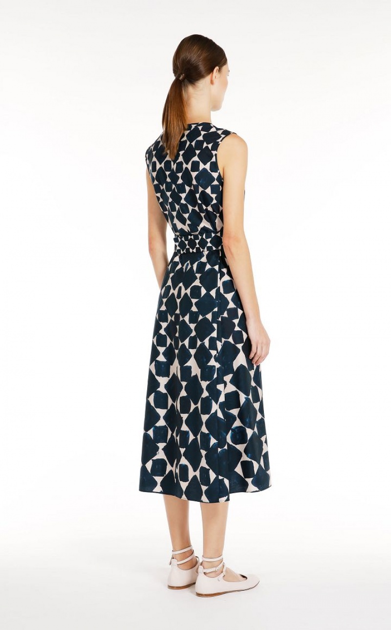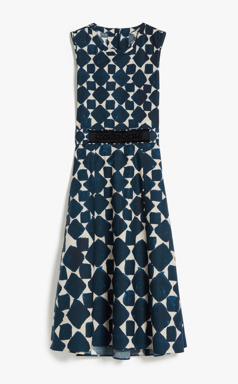 Long sleeveless dress in pure cotton poplin fabric featuring an exclusive-patterned placed print, designed specifically for the model in question. The flared model boasts a full pleated skirt, press-stud fastening and a matching belt, complete with black jet embroidery set on a fringed base fabric. Length: 124 cm.