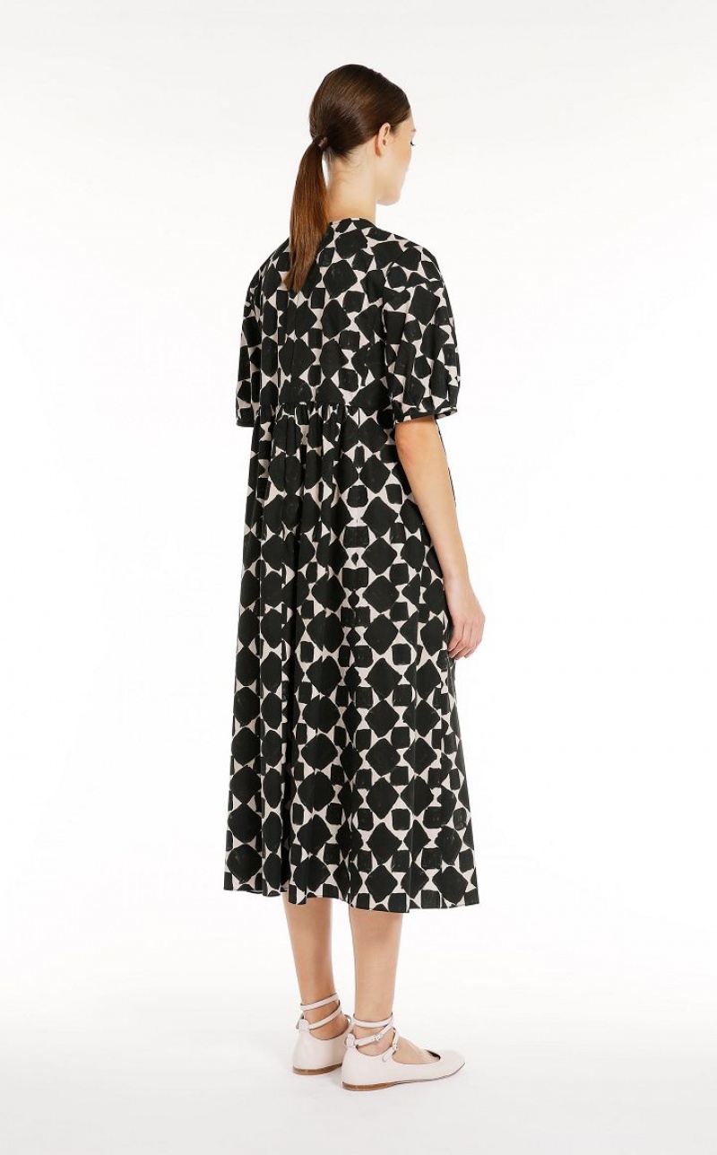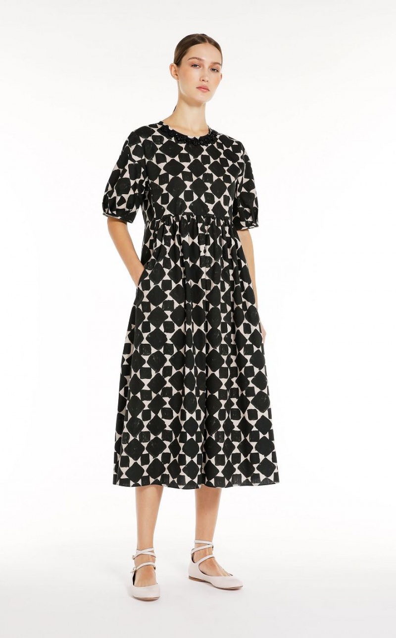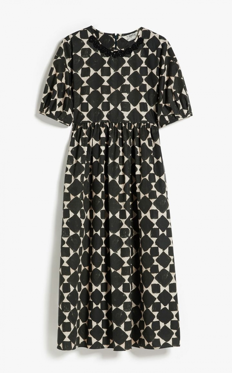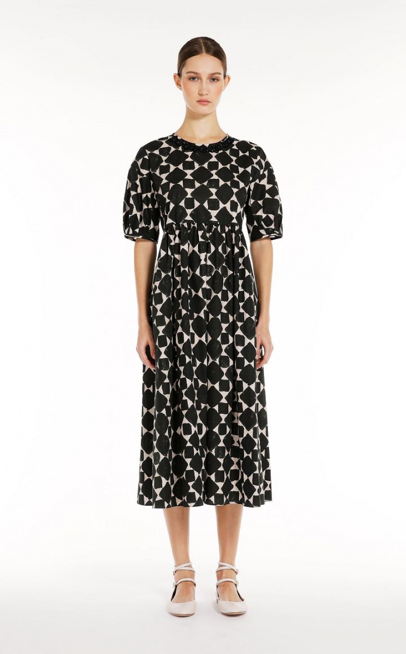 Long crew-neck dress in printed pure cotton poplin fabric featuring short balloon sleeves and a flared skirt. Removable embroidered necklace-embellished neckline. Length: 121 cm.
