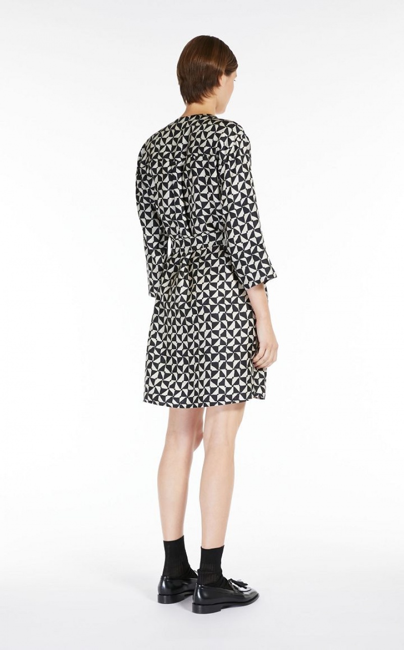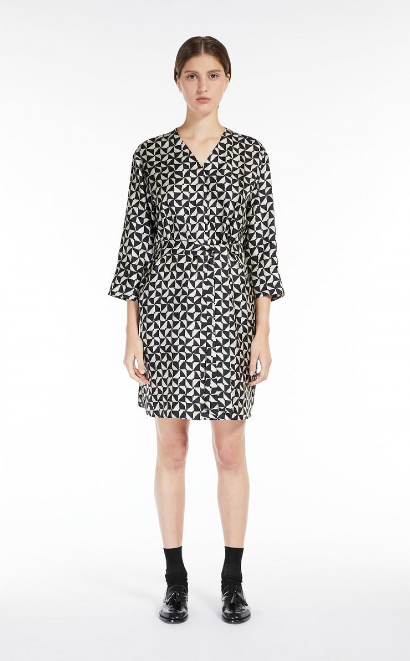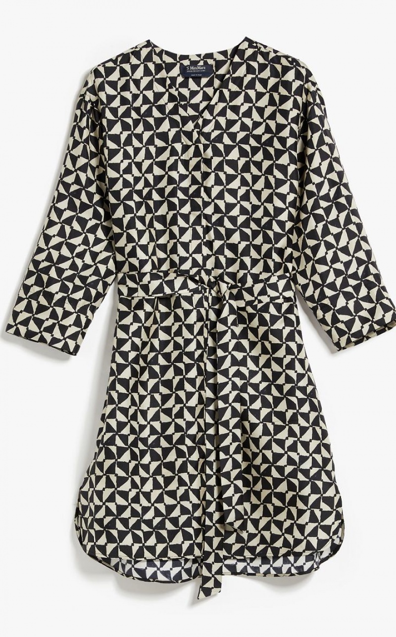 Kaftan-style short dress in fine printed pure silk twill fabric. The fluid-fit model boasts a V-neckline and side slit detail at the hem. Feminine silhouette-accentuating matching belt. Concealed button fastening. Length: 94 cm.