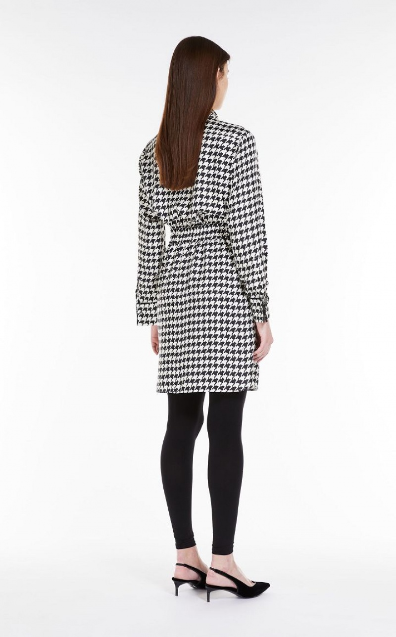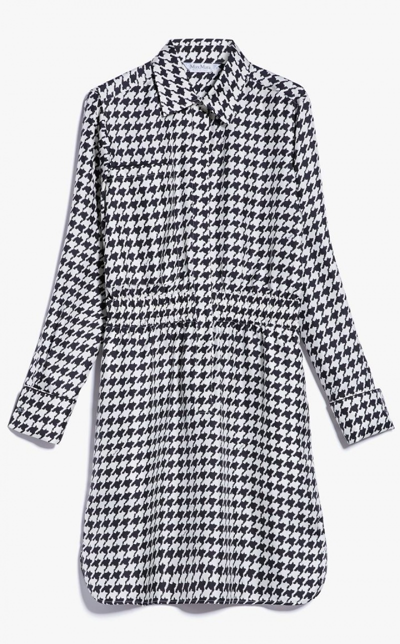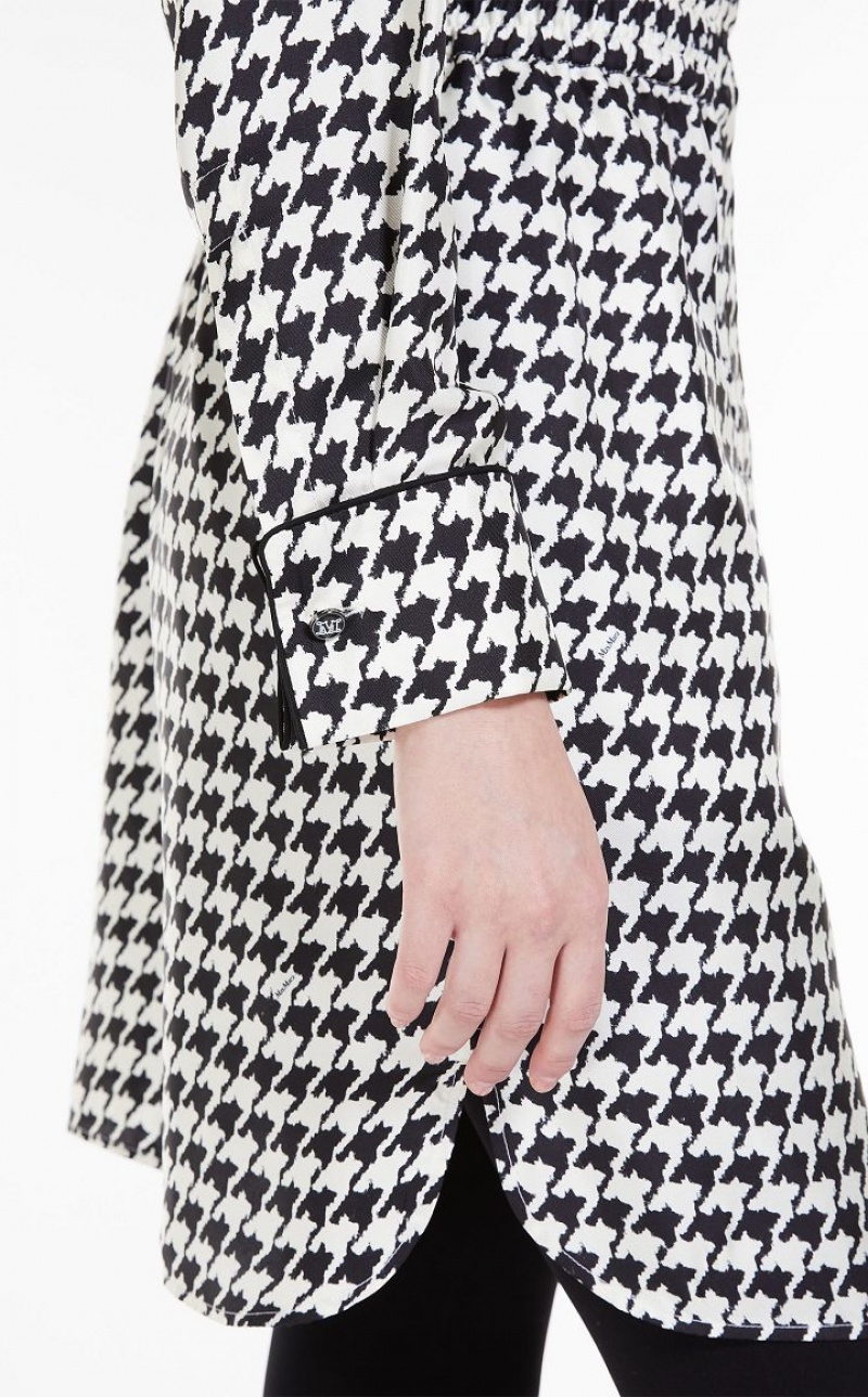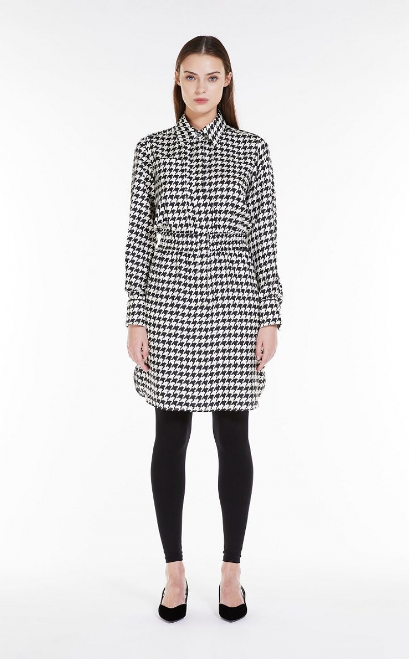 Short shirt dress in exquisite printed pure silk twill with a fitted silhouette, high elasticated waist, gathered motif and small rounded slits at the hem. The style features a shirt collar, maxi patch pocket on the chest and long sleeves with deep turn-up cuffs with piping and jewel buttons. The matching belt allows you to accentuate the waist. Concealed button fastening at the front. Length: 90 cm.
