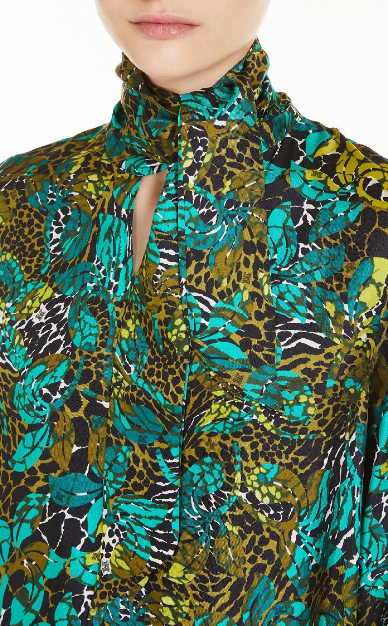 Long shirt dress in fine pure silk twill with all-over printed motif, embellished with a foulard collar open on the front and long sleeves with shirt cuffs. The straight volume with horizontal cut on the back allows you to obtain proportions that can be adapted to different silhouettes. Unlined style finished with lateral vents and customised rounded-button fastening. Length: 135 cm.