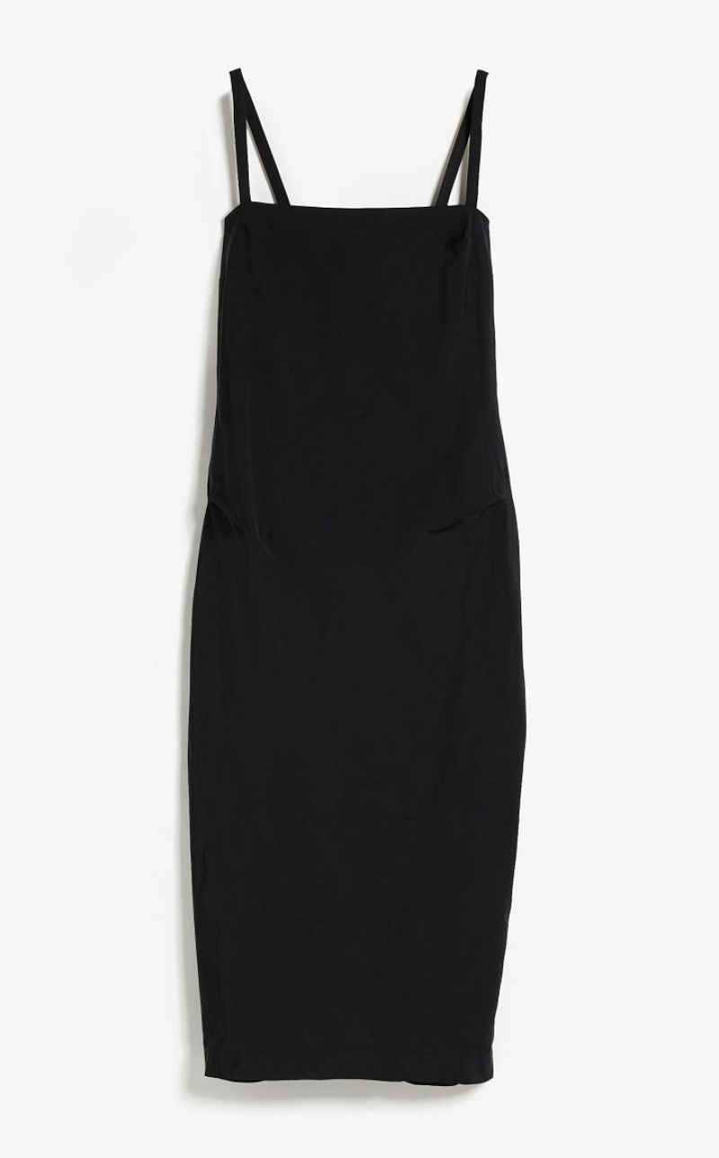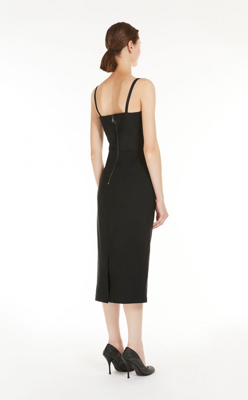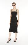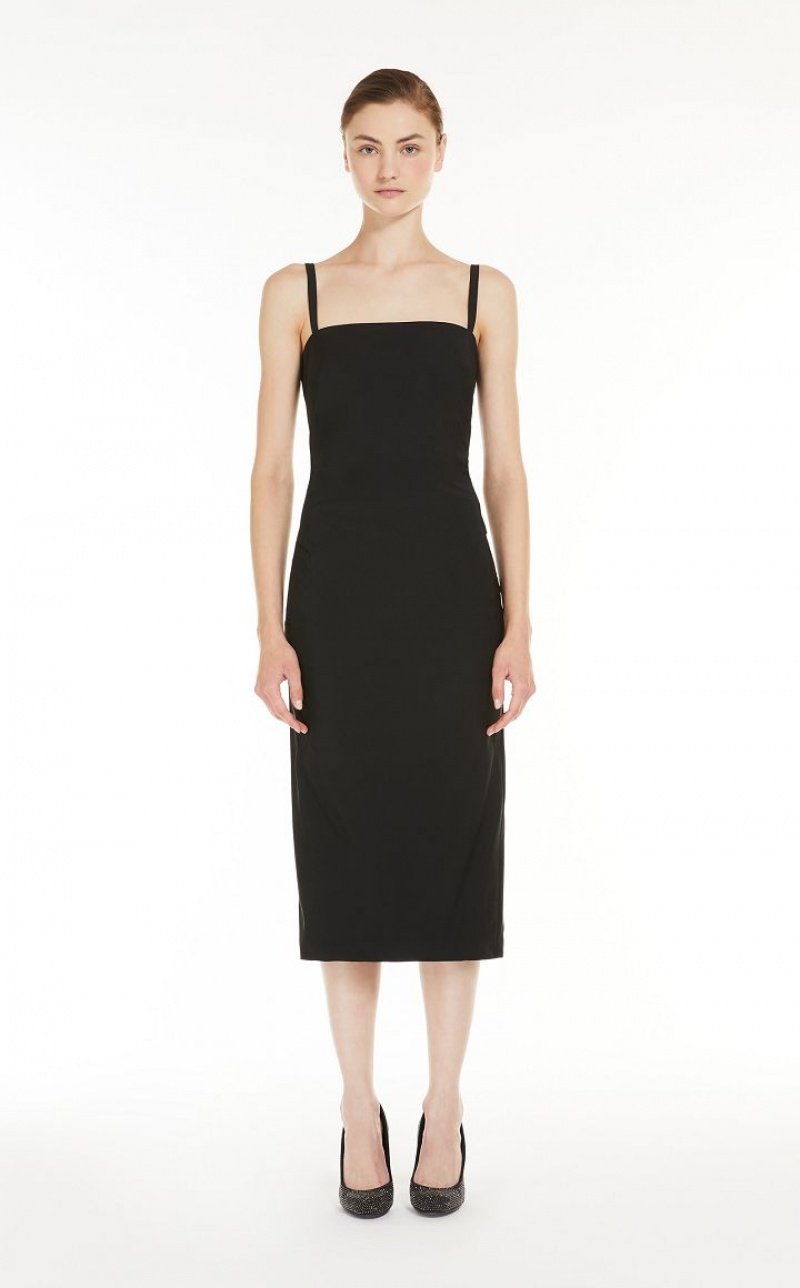 Midi dress made of radzimir with an ultra-feminine silhouette, bustier neckline, thin shoulder straps and central slit on the back. Lined style, closes with metal zip on the back. Length: 120 cm.
