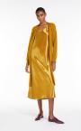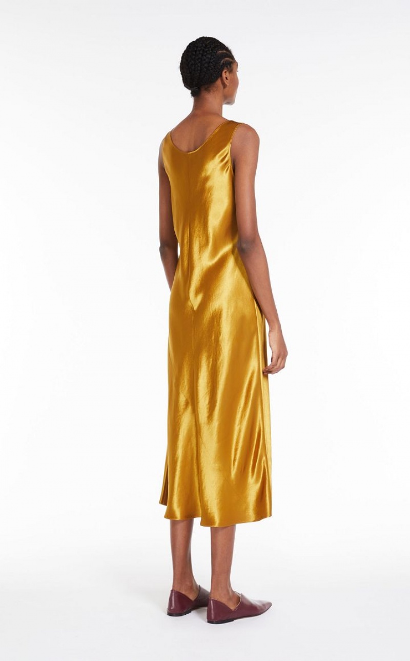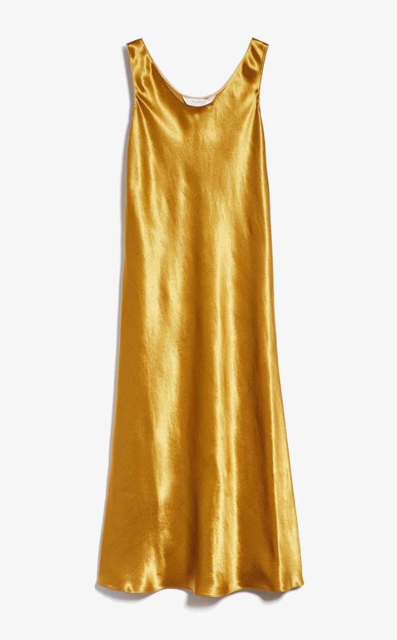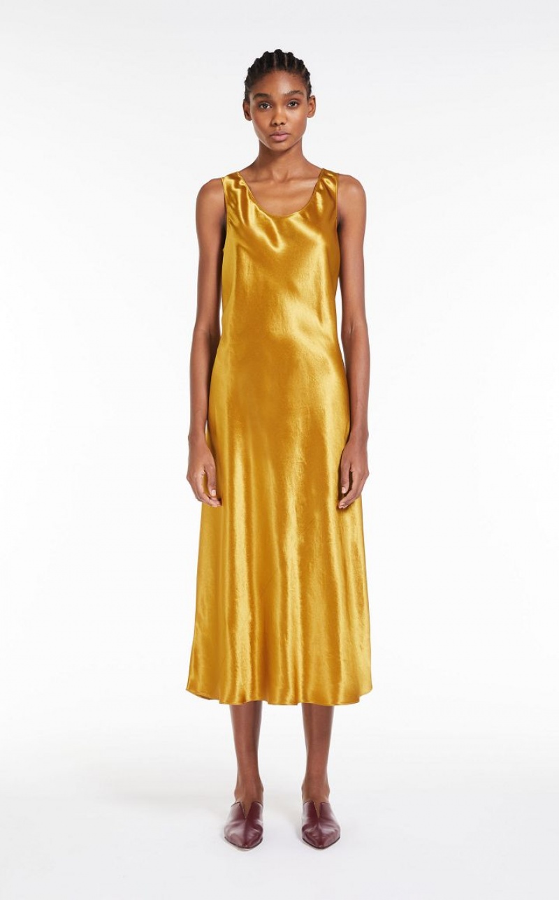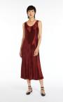 Sleeveless midi dress in acetate satin with a characteristic worn look, wide round neckline and flowing line with a diagonal cut on the front. Length: 124 cm.