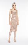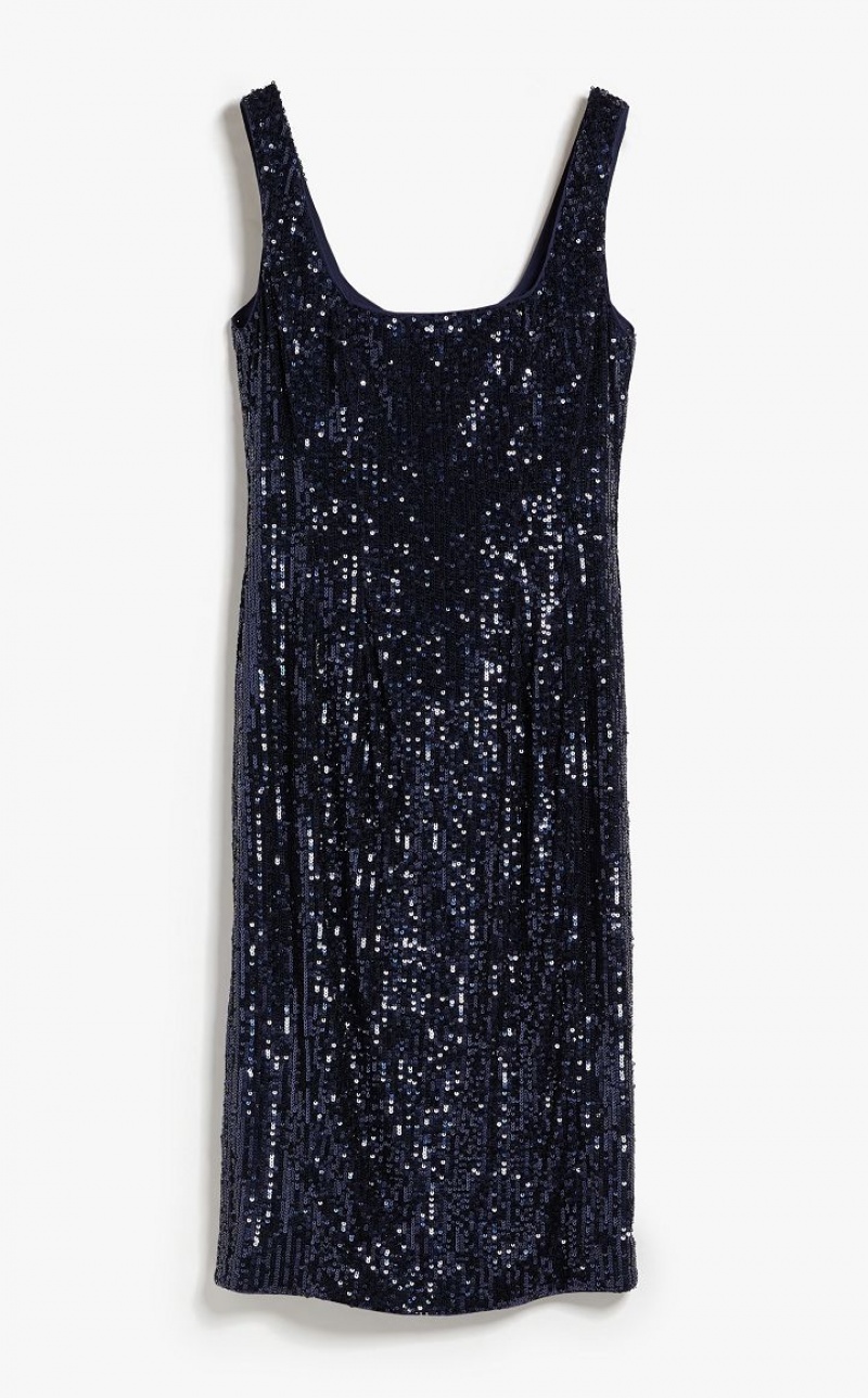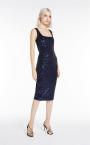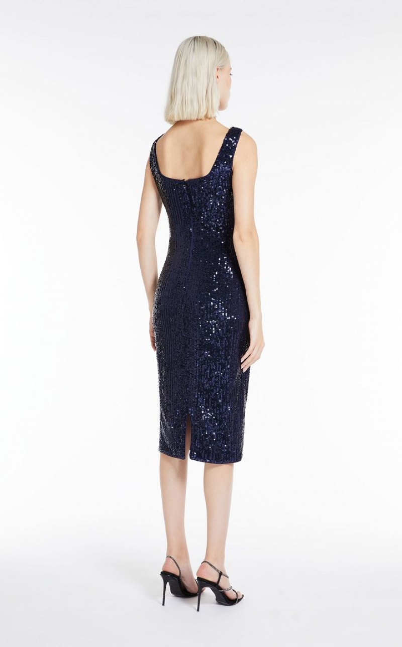 Long sleeveless sheath dress embroidered in all-over small metal-look sequins. The décolleté is framed by an elegant geometric neckline. Lined model. Length: 110 cm.