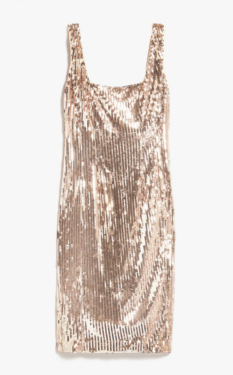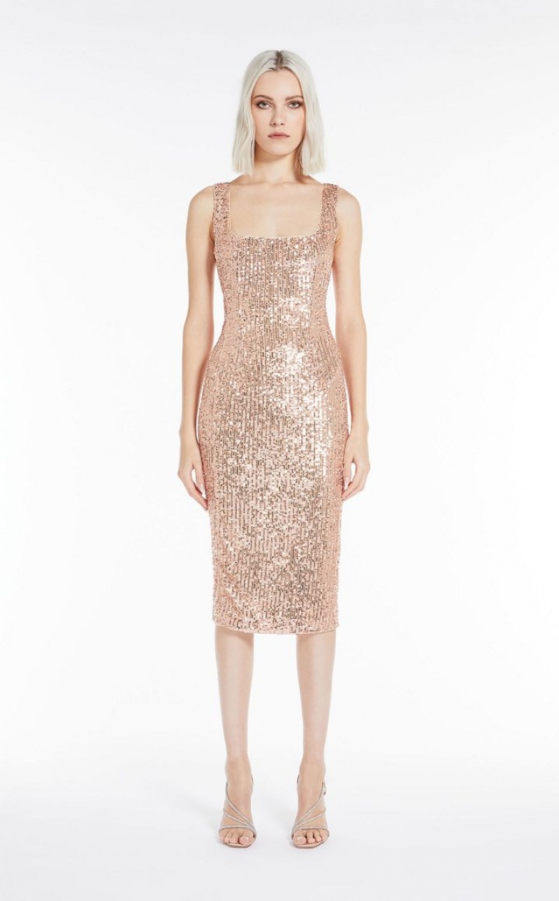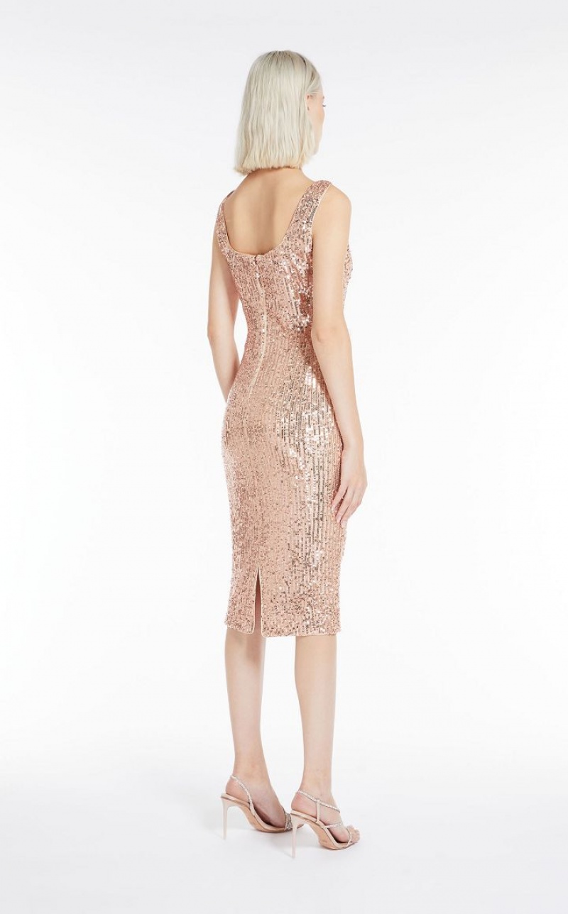Long sleeveless sheath dress embroidered in all-over small metal-look sequins. The décolleté is framed by an elegant geometric neckline. Lined model. Length: 110 cm.