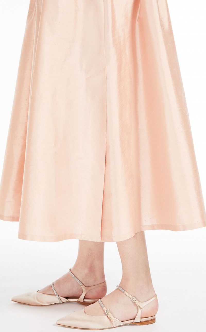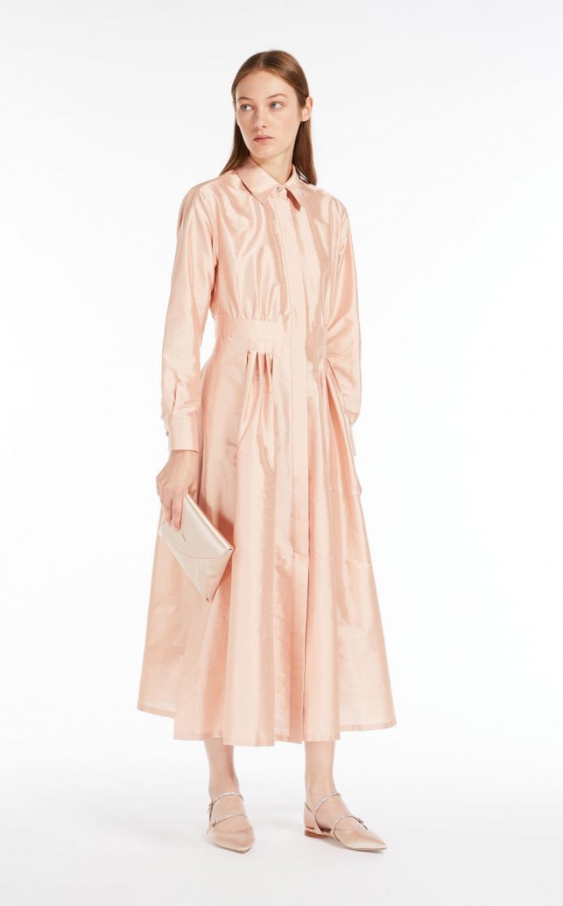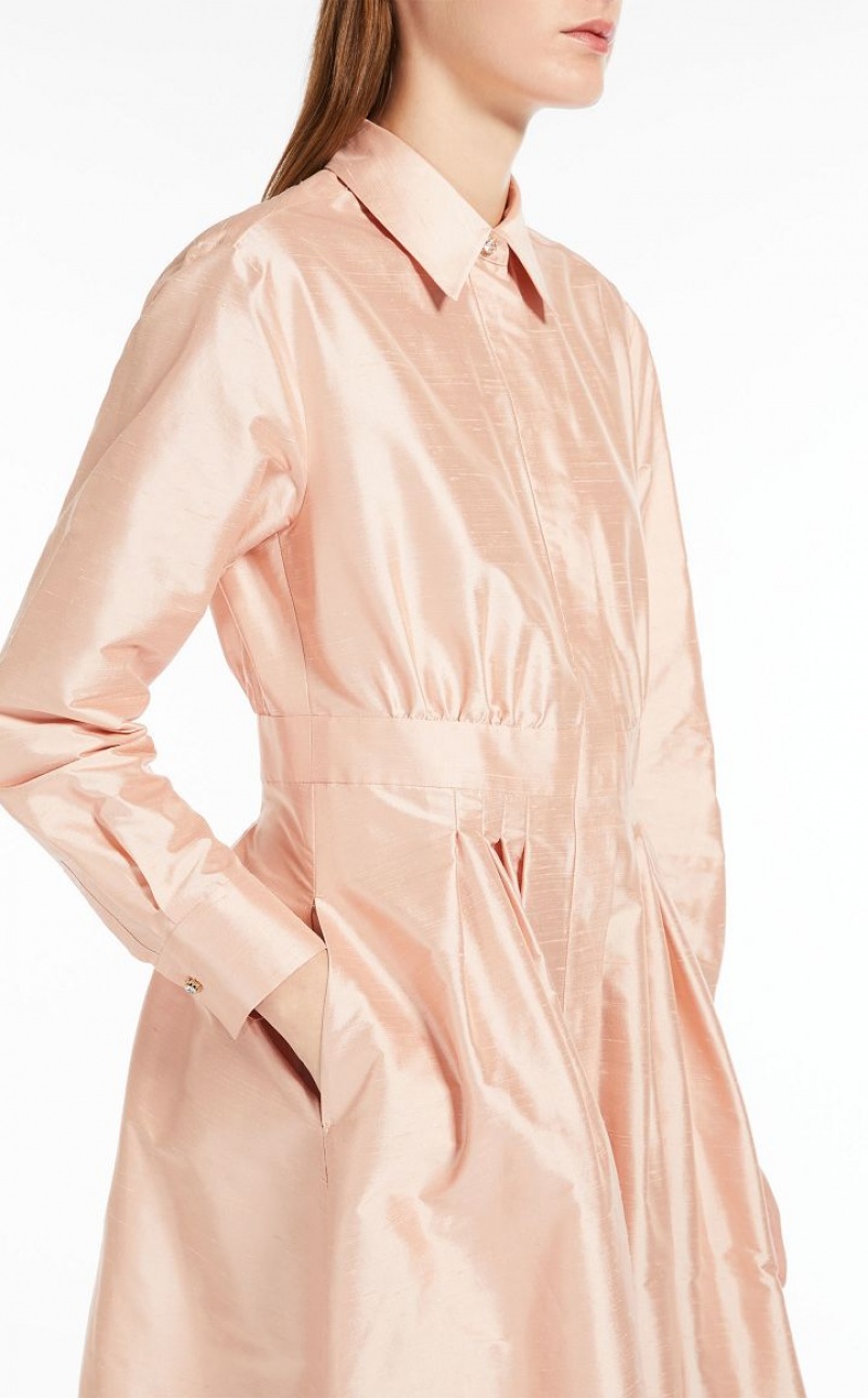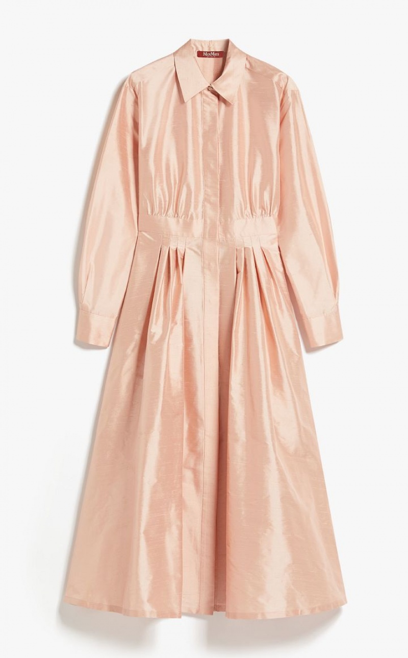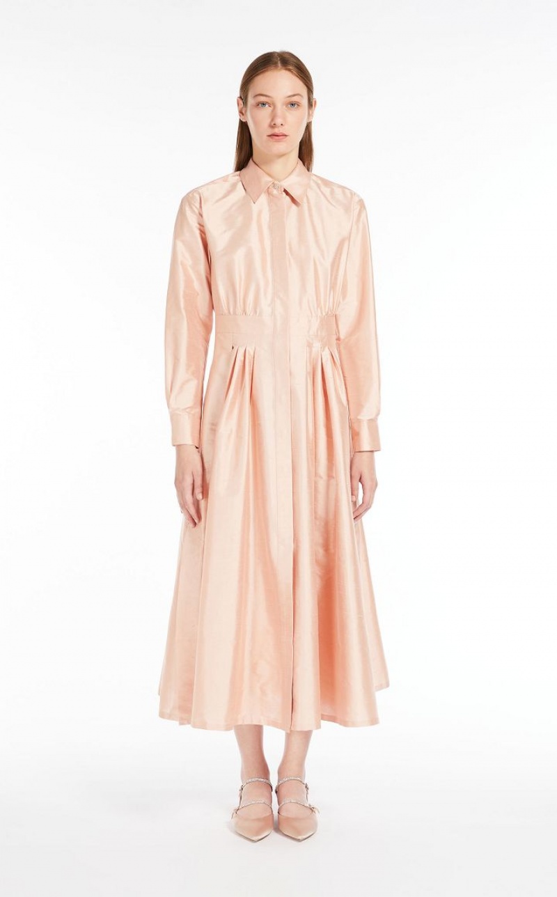Elegant long shirt dress in fine pure silk shantung fabric featuring a pointed collar and long cuffed sleeves. The flared model boasts a waistline-accentuating matching belt. Length: 130 cm.