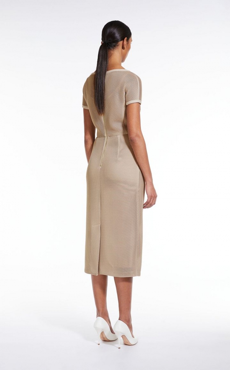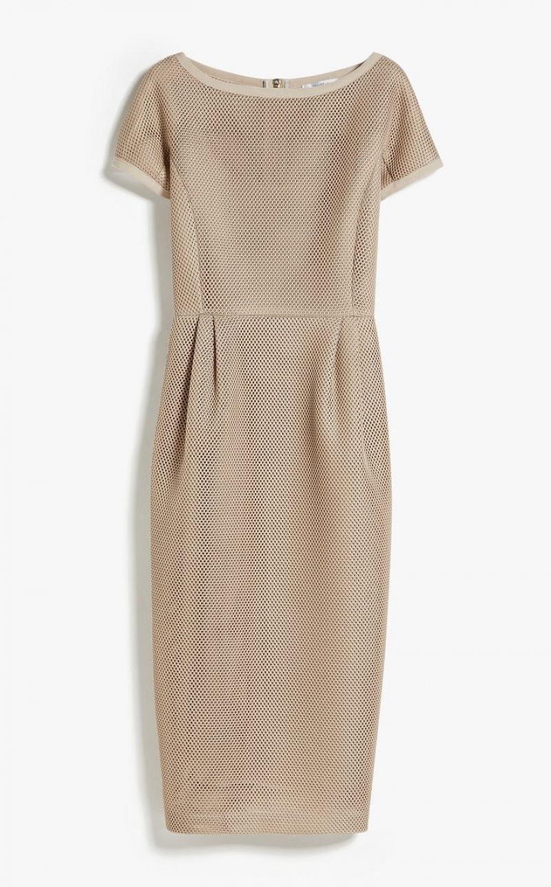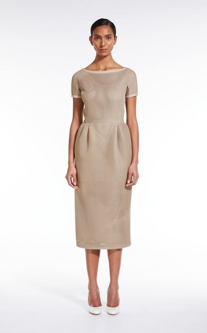 Short-sleeved sheath dress made of soft mesh-effect technical jersey. Fitted silhouette with a boat neckline, the style is cut in at the waist and features side zip pockets. Finished with matching slip lining in stretch viscose jersey. Metal zip fastening at the back. Length: 115 cm.