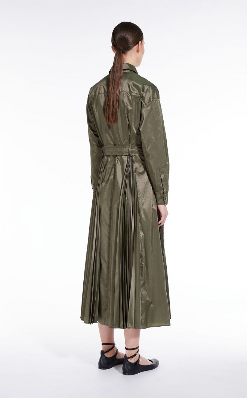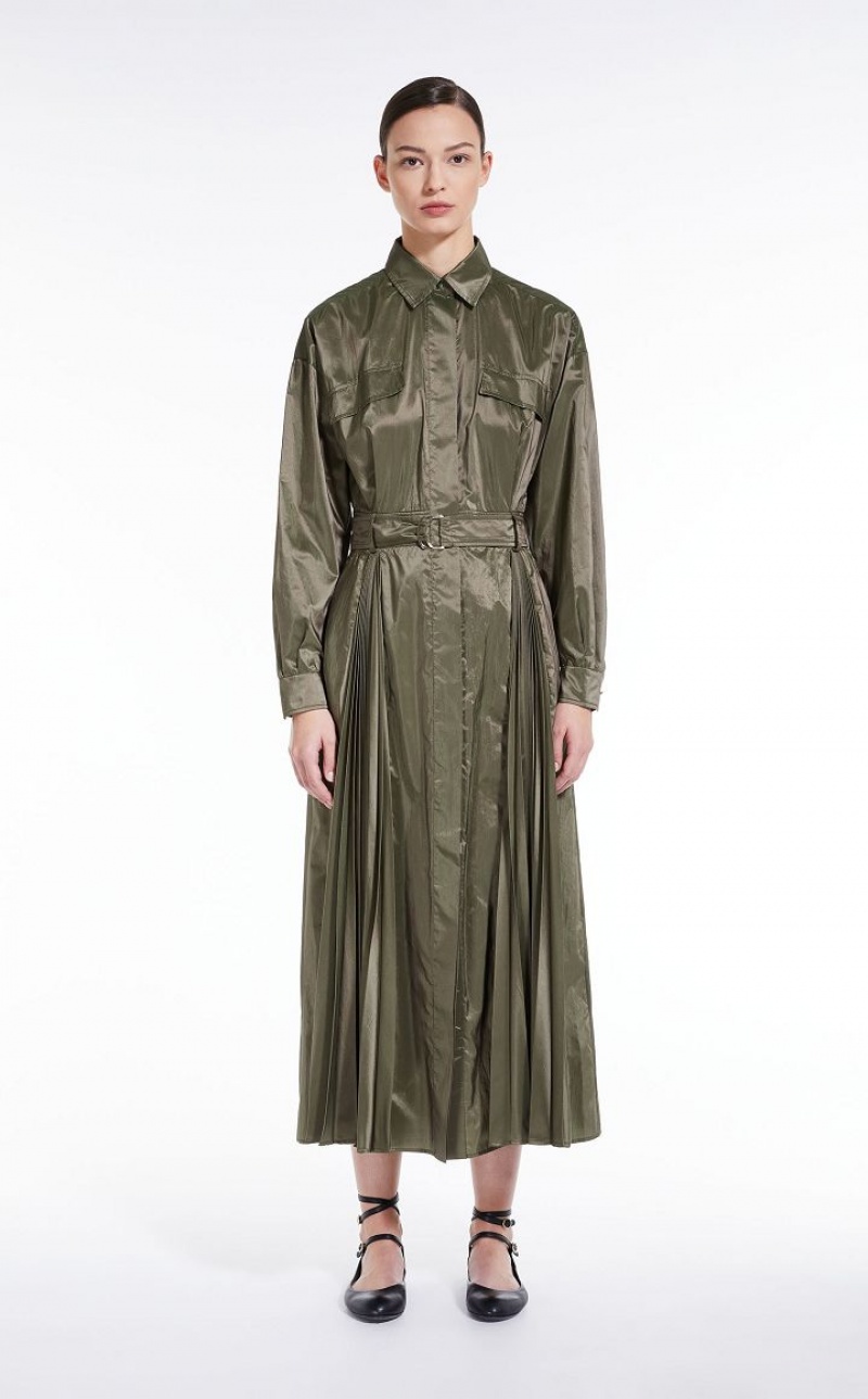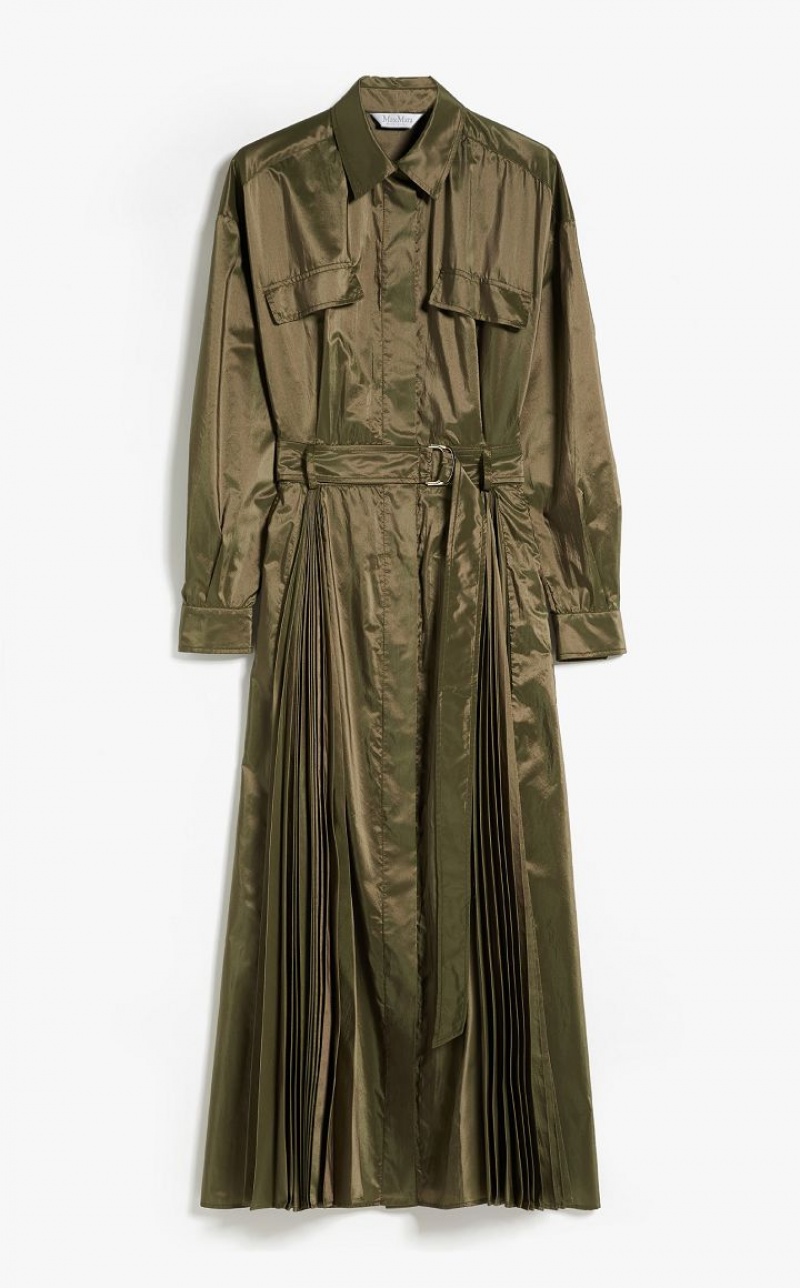 Shirt dress made of fine yarn-dyed silk-blend cloth, with shirt collar and long wide dropped set-in sleeves with cuffs. The skirt’s wide, feminine silhouette is defined by pleated panels inserted in the vertical cuts and a matching belt with a metallic ring buckle that accentuates the waist. Finished with small, applied flap pockets on the chest. Concealed fastening with buttons. Length: 130 cm.
