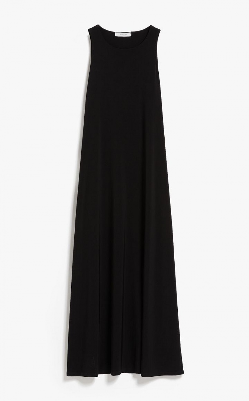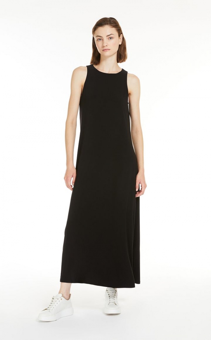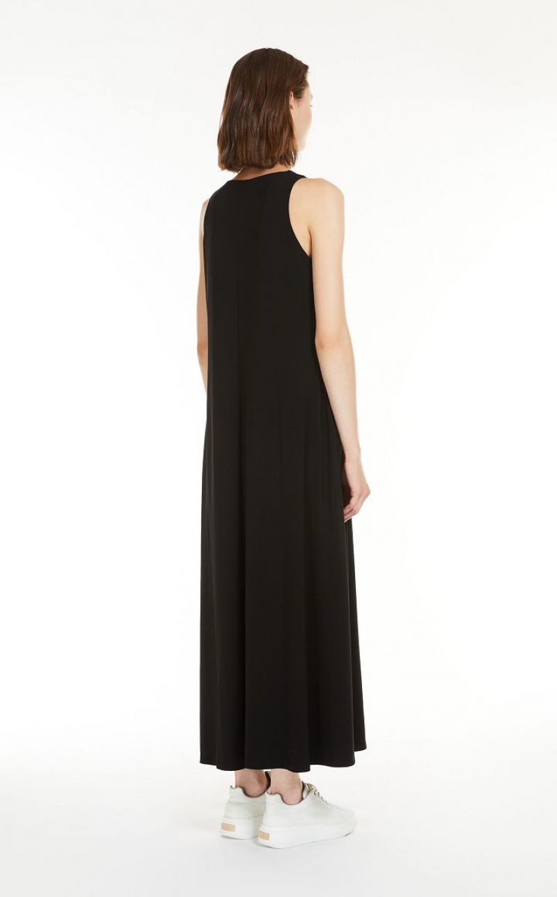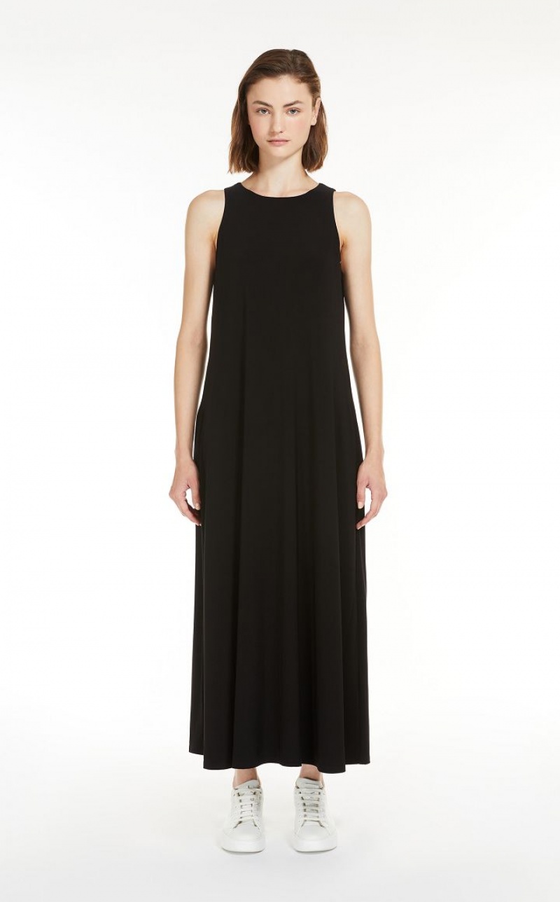 Long sleeveless dress in soft two way stretch jersey fabric. Both the flared silhouette and fluid fabric bestow subtle, feminine movement at the hem.