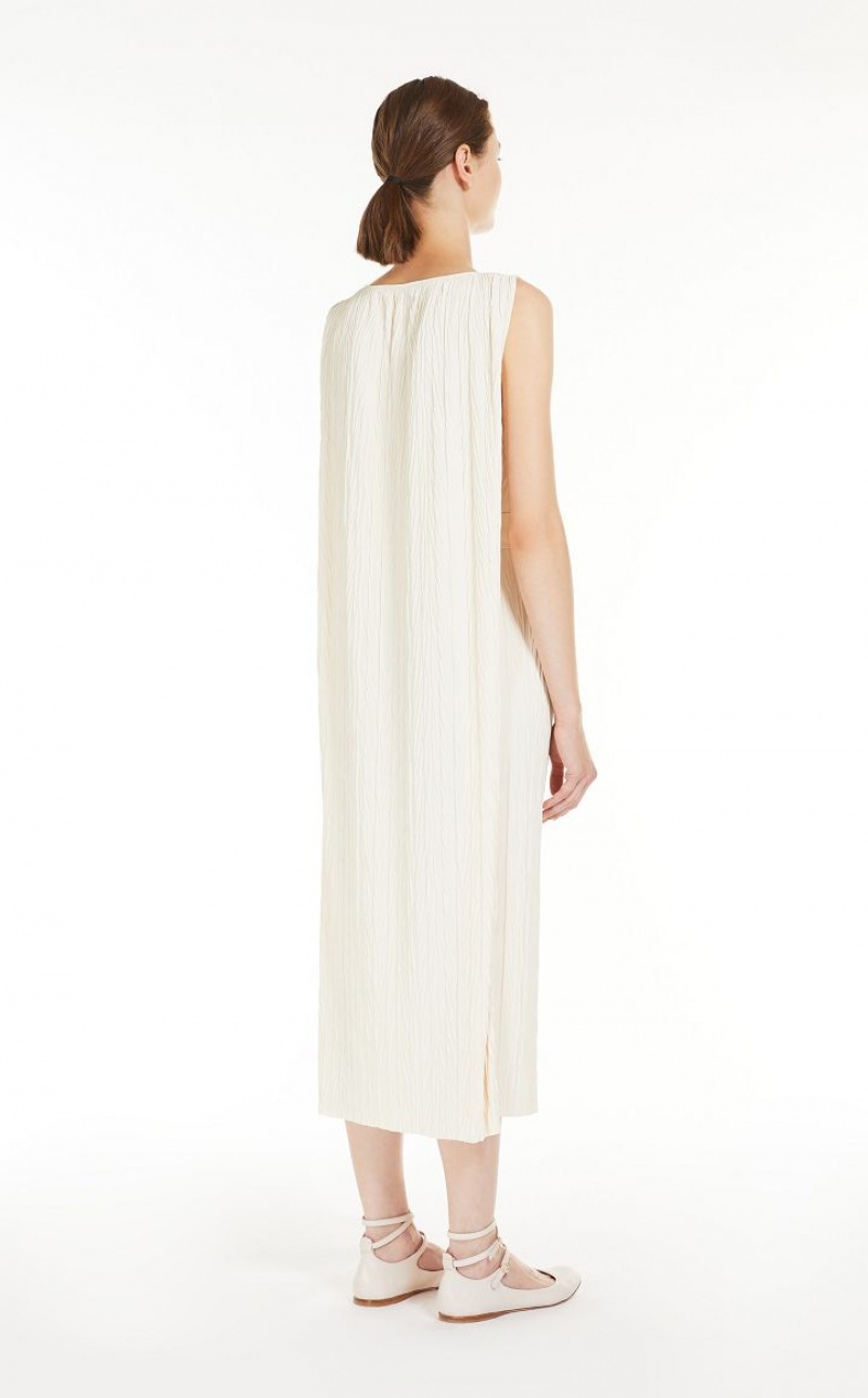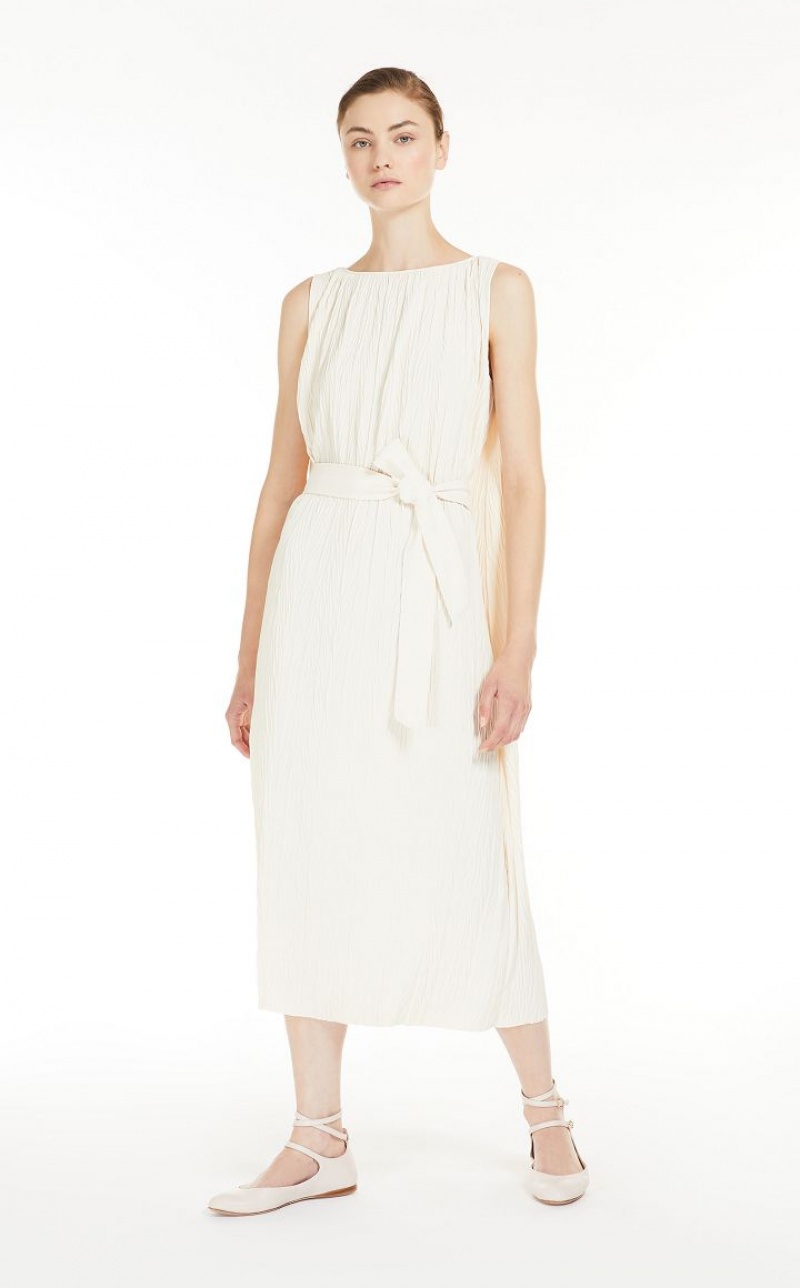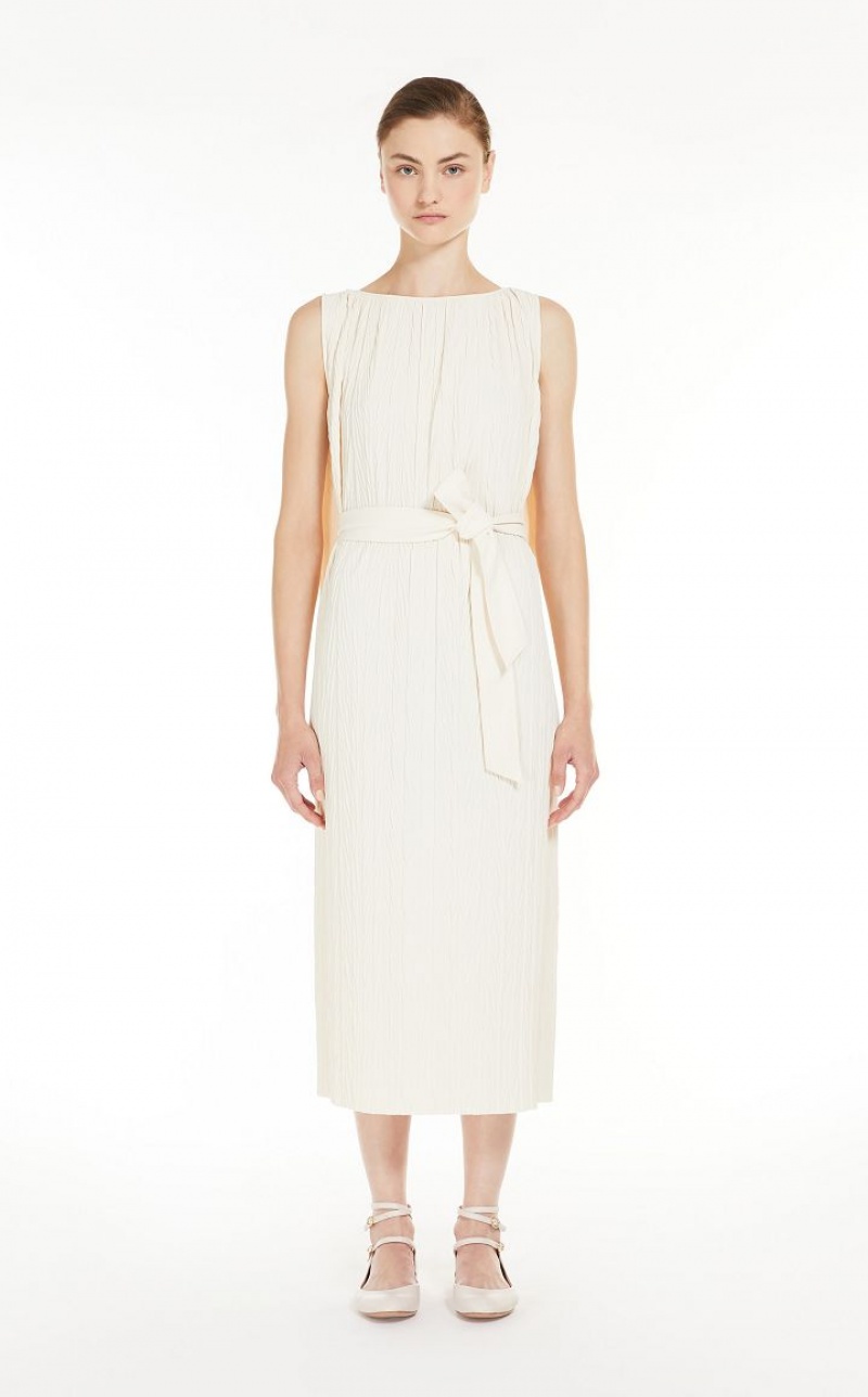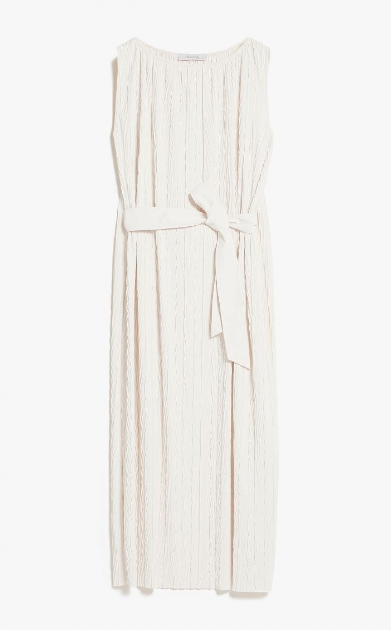 Sleeveless tunic dress in soft two way stretch jersey fabric featuring bark look vertical pleat detail and a boat neckline. The matching waist belt complete with belt loop detail at the sides can either be tied at the front or the side.