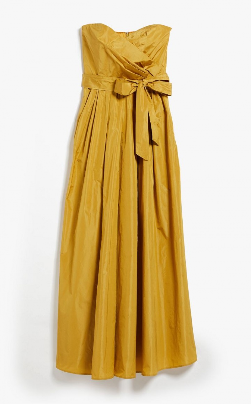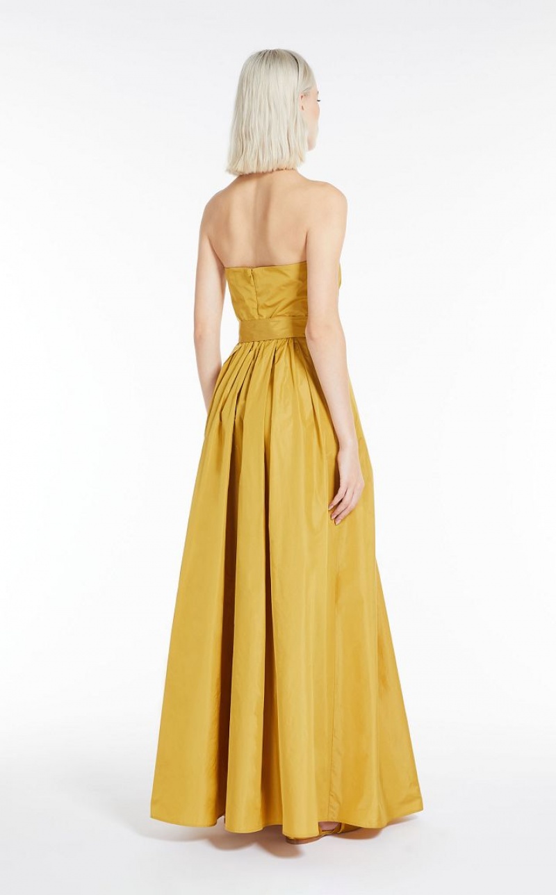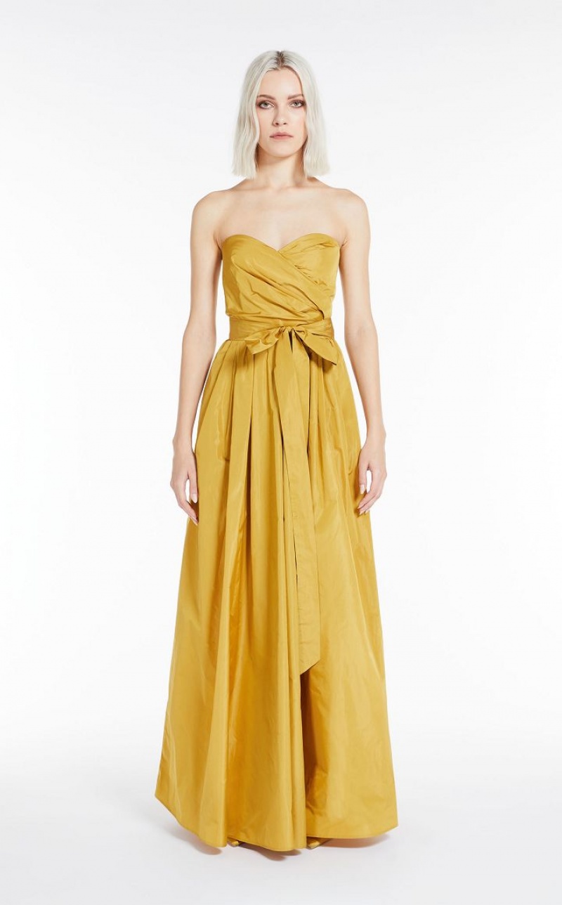 Long bustier dress in silk-blend taffeta fabric featuring elegant couture-inspired draped detail, in addition to a silhouette-accentuating matching waist belt. Lined model. Length: 115 cm.