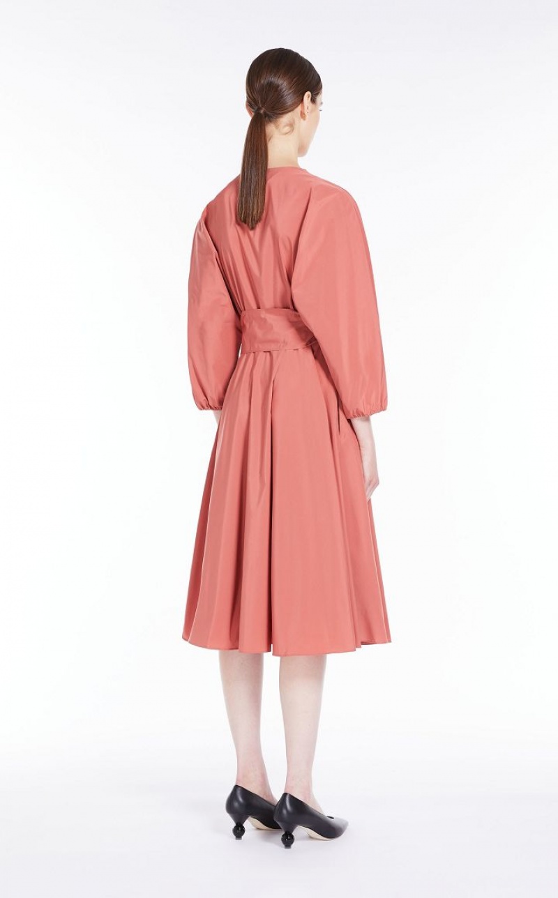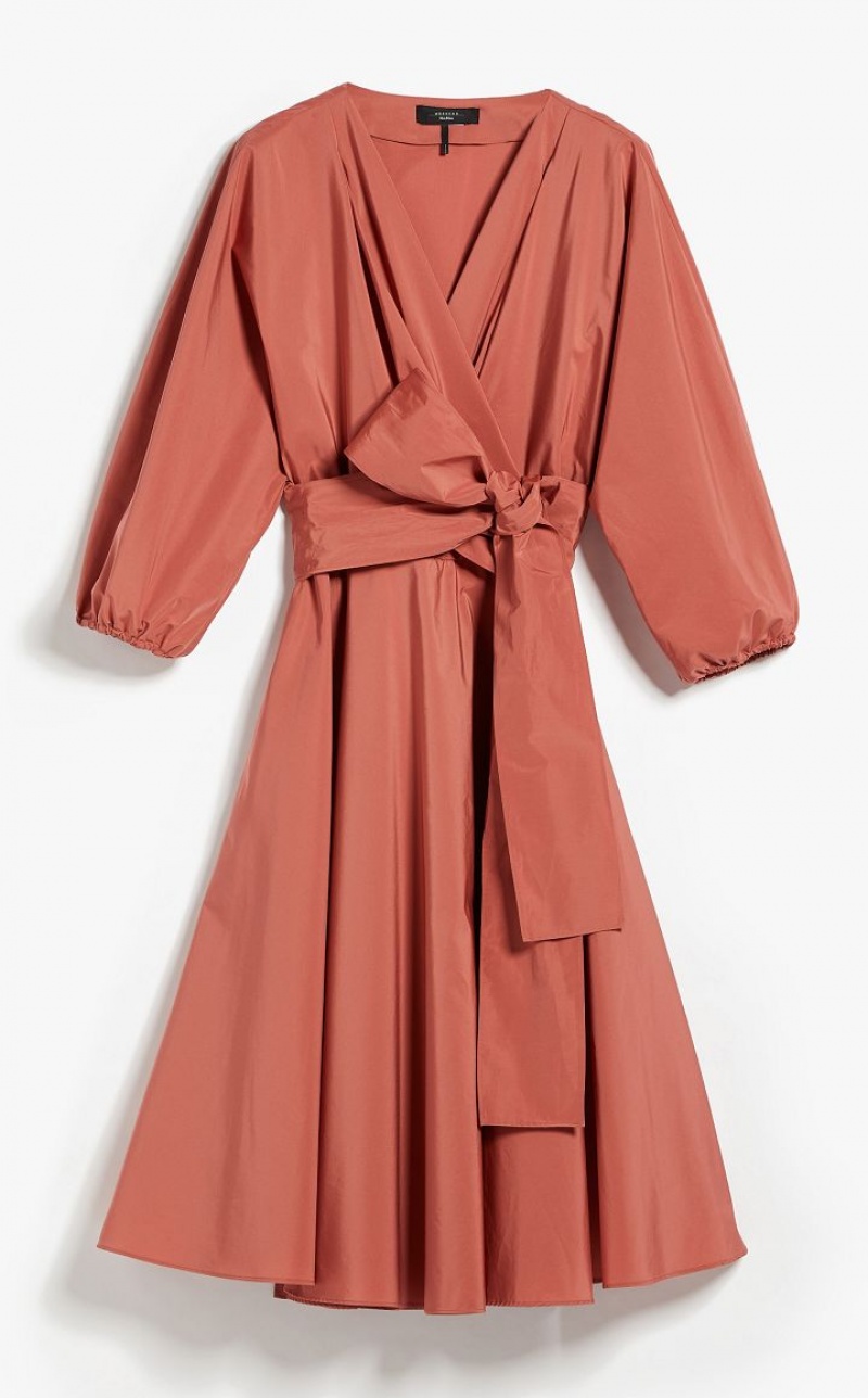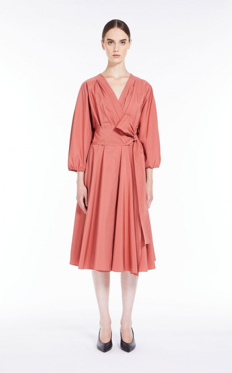 Midi-length wrap-style dress in lightweight cotton blend taffeta. This style has a crossover V-neck with draping, 3/4 kimono sleeves with elasticated cuffs and a seam at the waist with full flared skirt. The matching belt ties at the waist to define the silhouette.