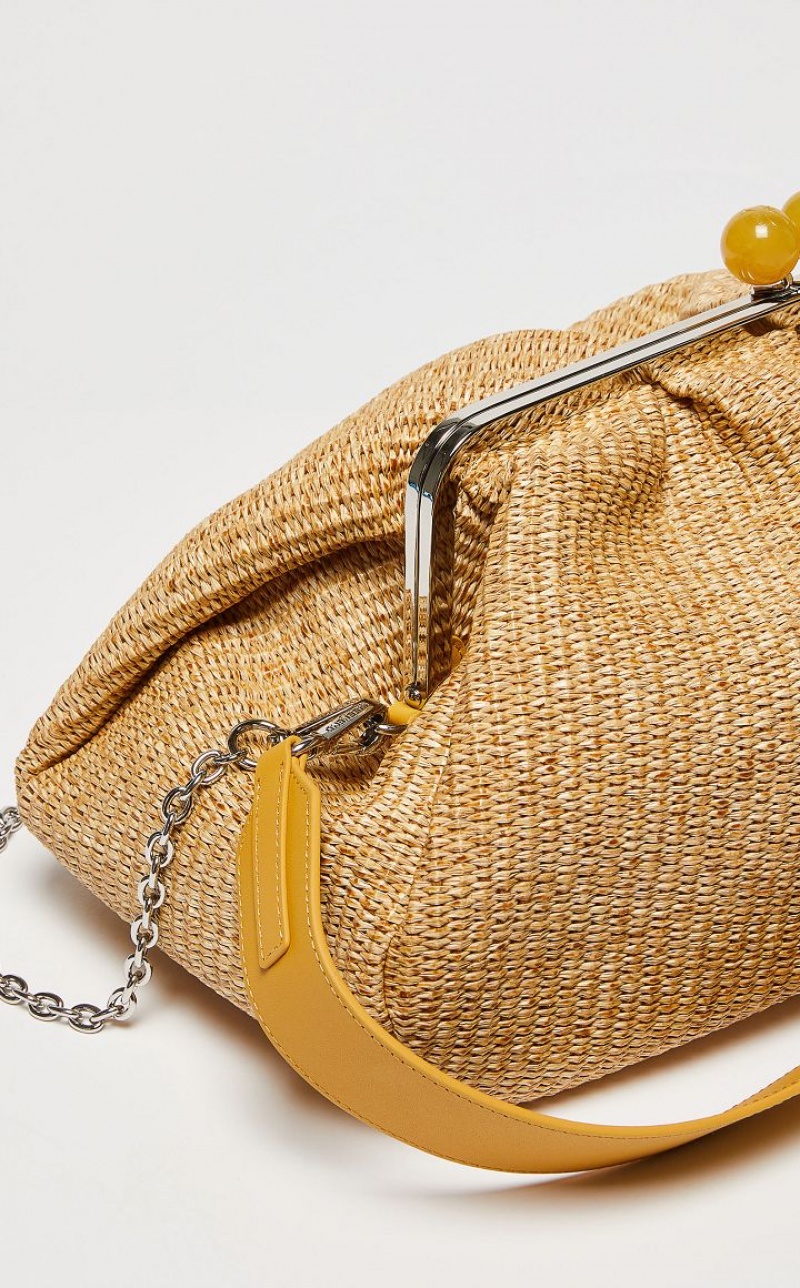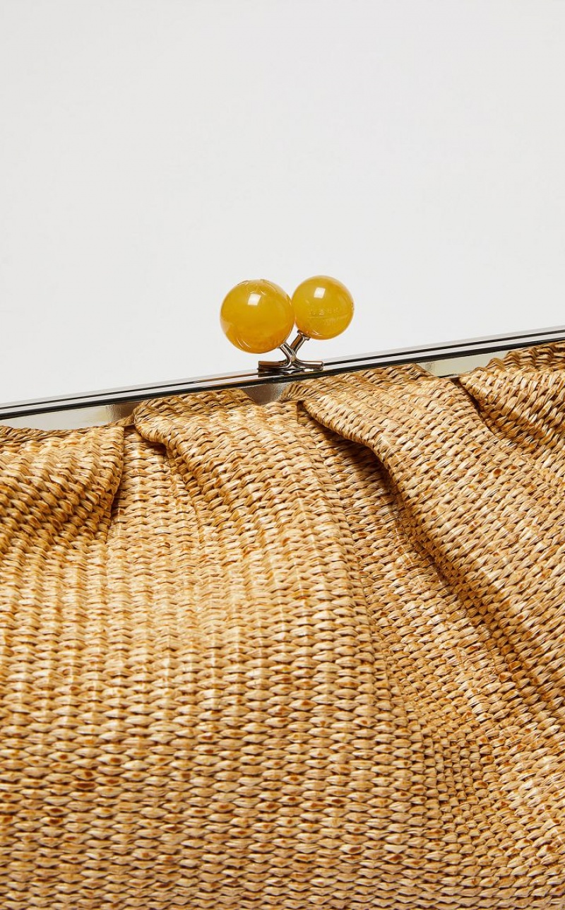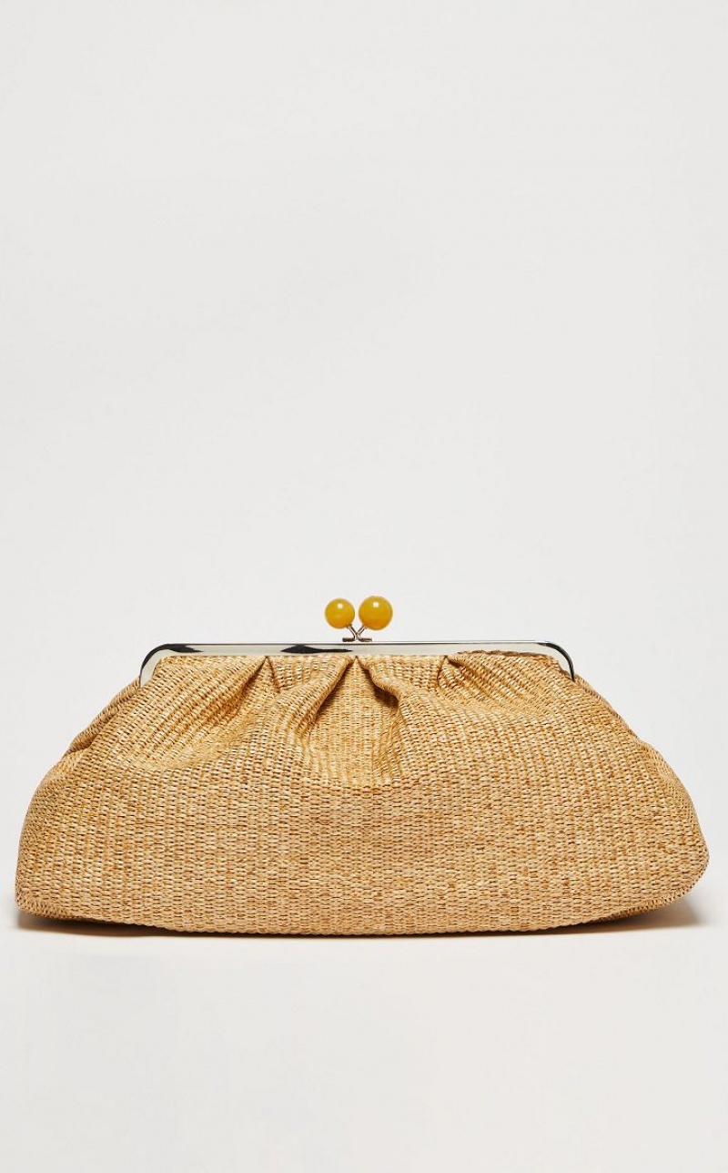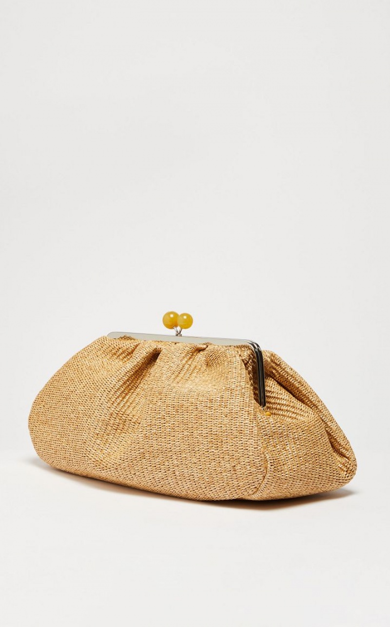 The Pasticcino Bag is the super clutch that adds a touch of personal charm to your everyday style. Large sized Pasticcino Bag in raffia, finished with handcrafted techniques creating three dimensional colour gradient effects. The detachable double chain and leather strap makes for a versatile style: the ideal crossbody or shoulder bag to accessorise an on trend outfit. Interior lined with striped twill and featuring an open pocket and custom label. Its deconstructed silhouette and deliberately oversized proportions make it perfect to meet your every need. Fastened with a matching opaline resin sphere, with butterfly detail and logo.