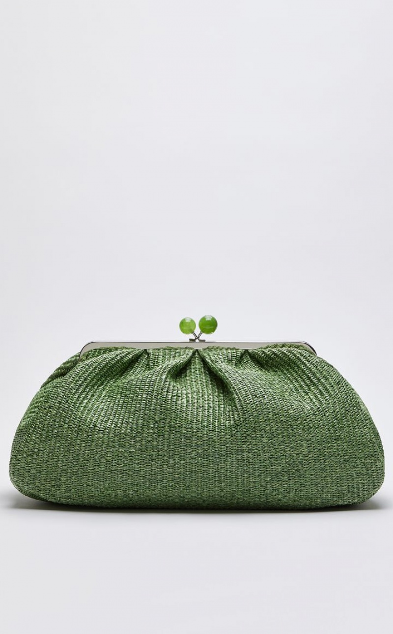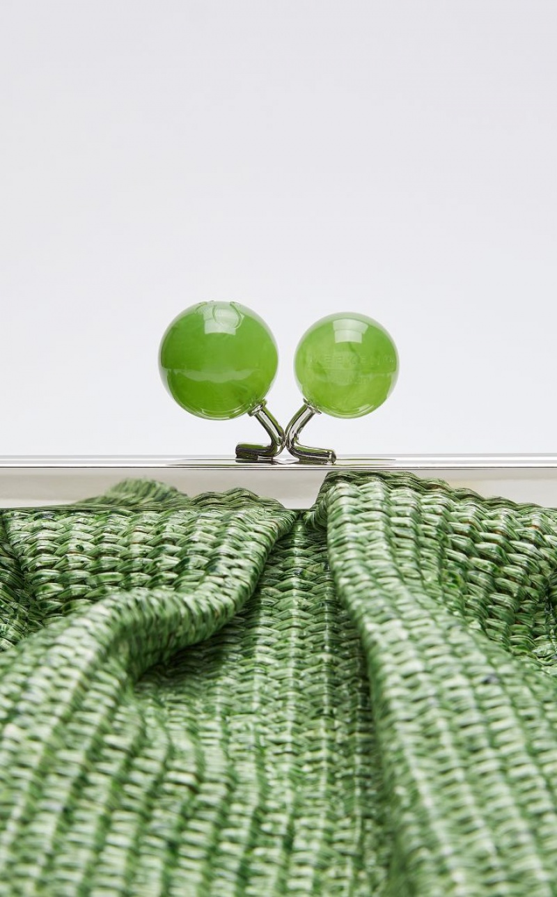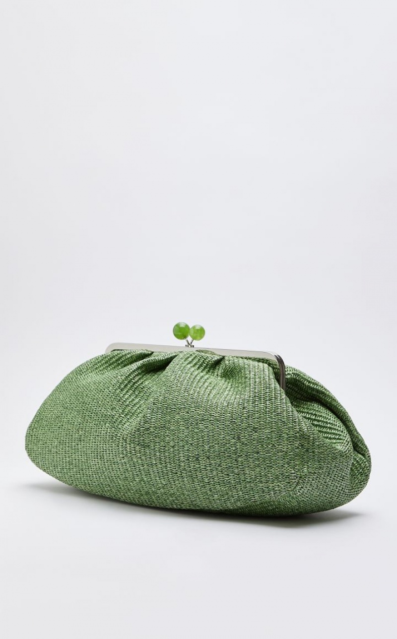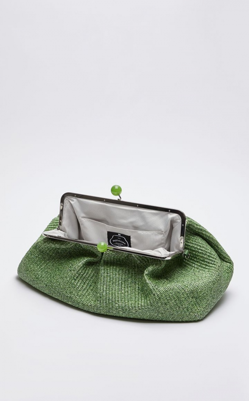 The Pasticcino Bag is the super clutch that adds a touch of personal charm to your everyday style. Large sized Pasticcino Bag in raffia, finished with handcrafted techniques creating three dimensional colour gradient effects. The detachable double chain and leather strap makes for a versatile style: the ideal crossbody or shoulder bag to accessorise an on trend outfit. Interior lined with striped twill and featuring an open pocket and custom label. Its deconstructed silhouette and deliberately oversized proportions make it perfect to meet your every need. Fastened with a matching opaline resin sphere, with butterfly detail and logo.