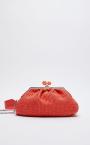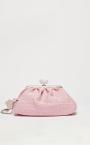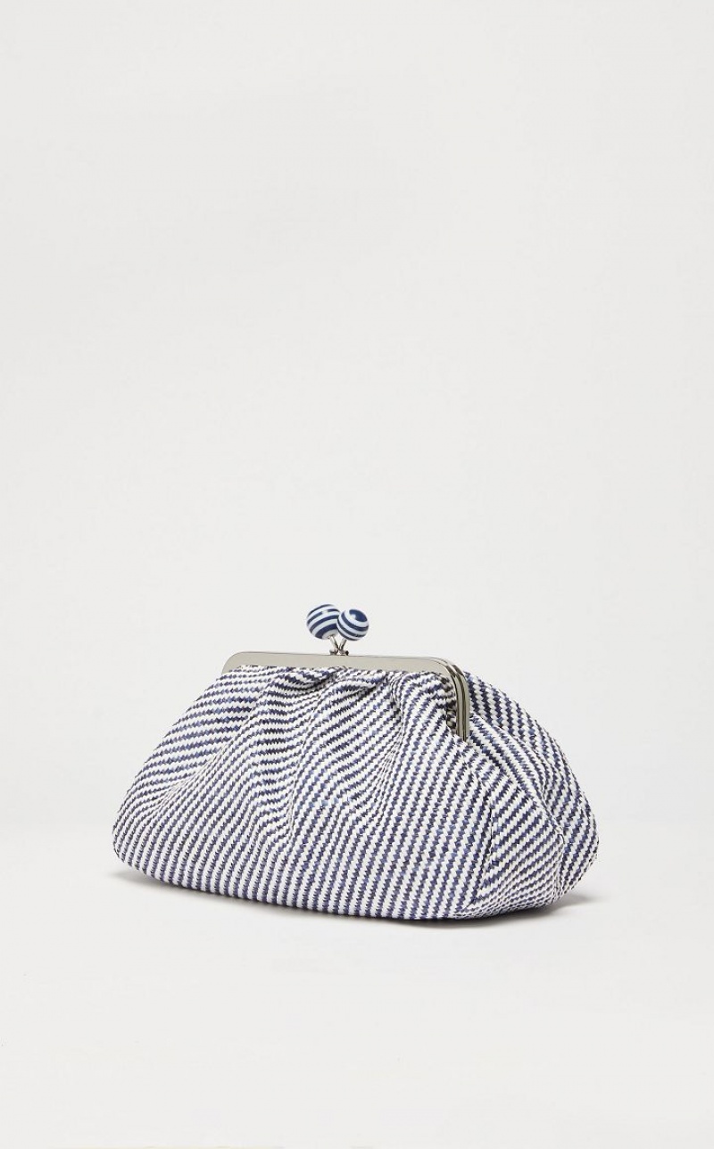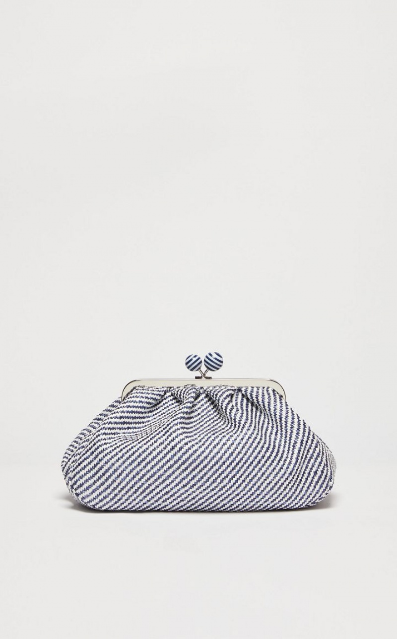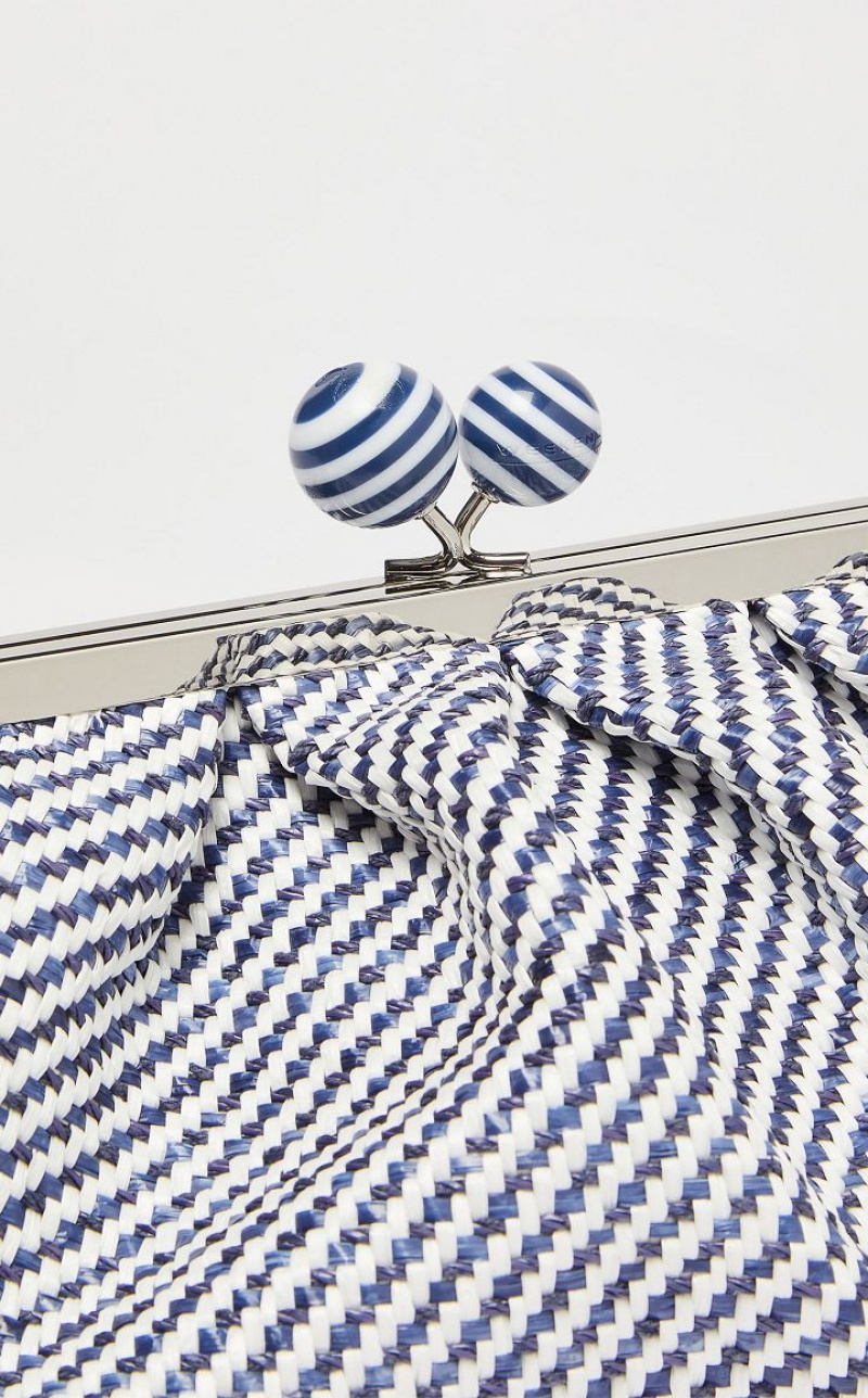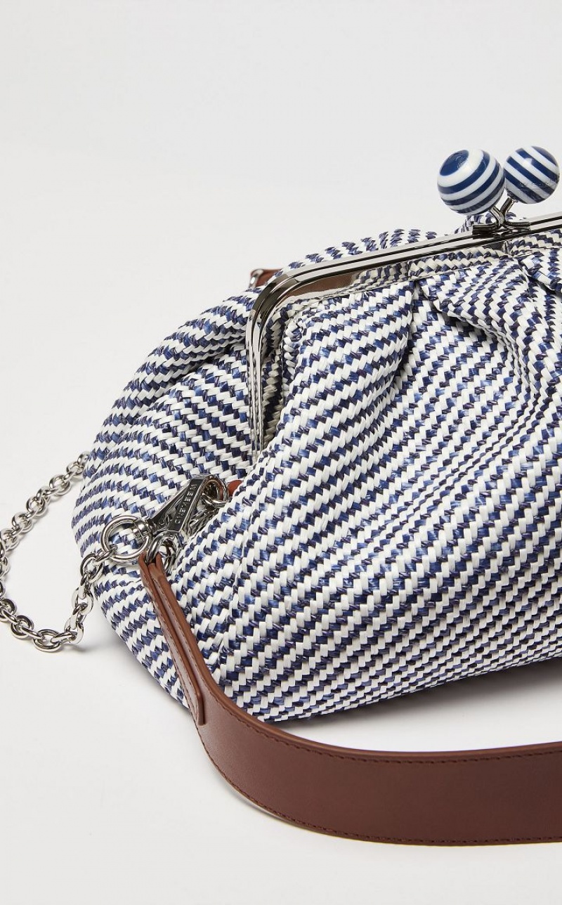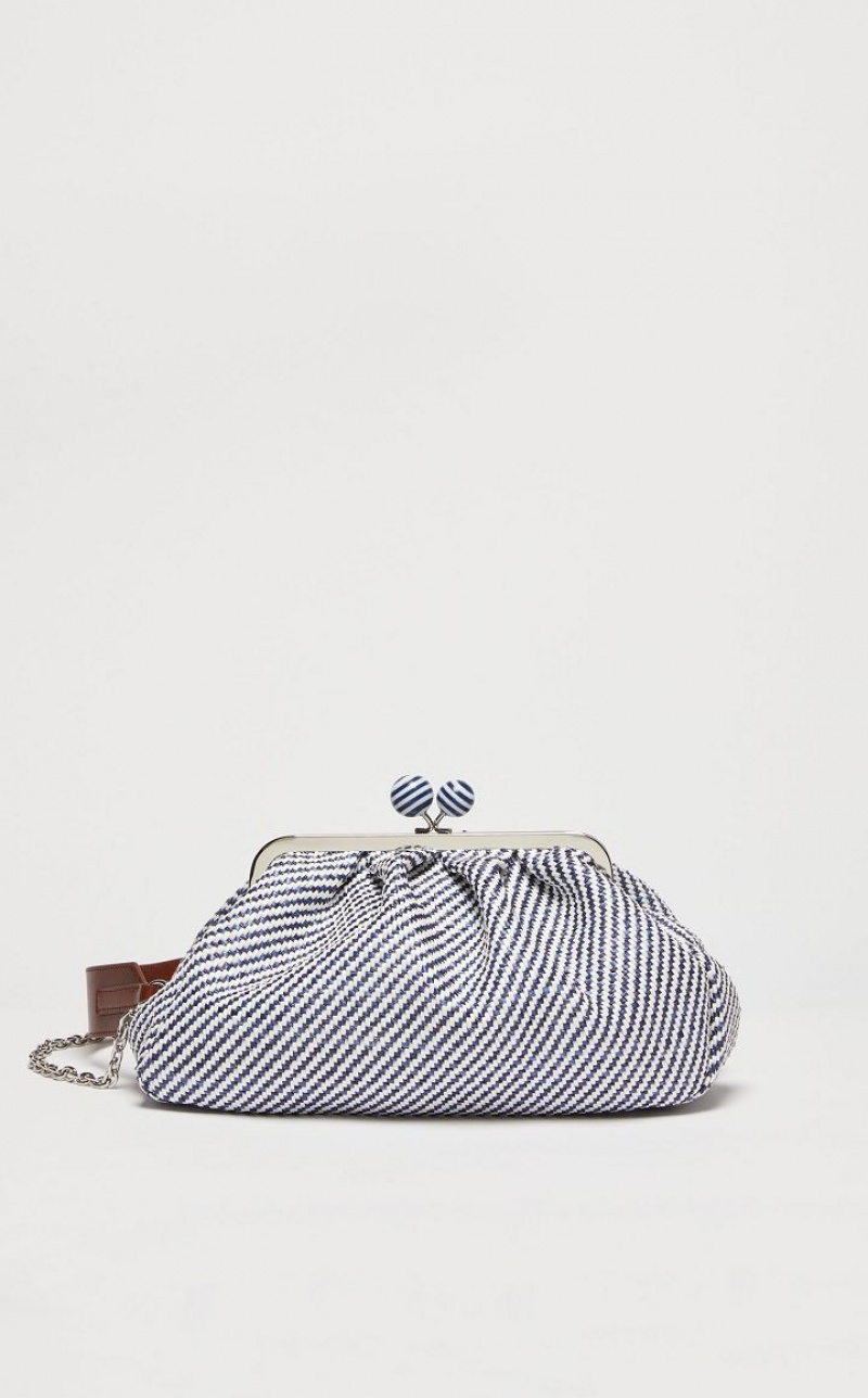 The Pasticcino Bag is the super clutch that adds a touch of personal charm to your everyday style. Medium sized Pasticcino Bag in raffia effect fabric, featuring tobacco brown leather details and a lined interior. With a double leather and chain shoulder strap, it can be carried on the shoulder or crossbody, for a versatile and trendy look. Finished with matching striped resin spheres and custom label on the inside. Its deconstructed silhouette and deliberately oversized proportions make it perfect to meet your every need.