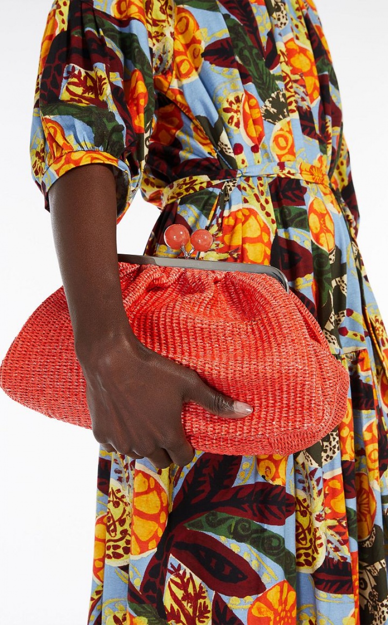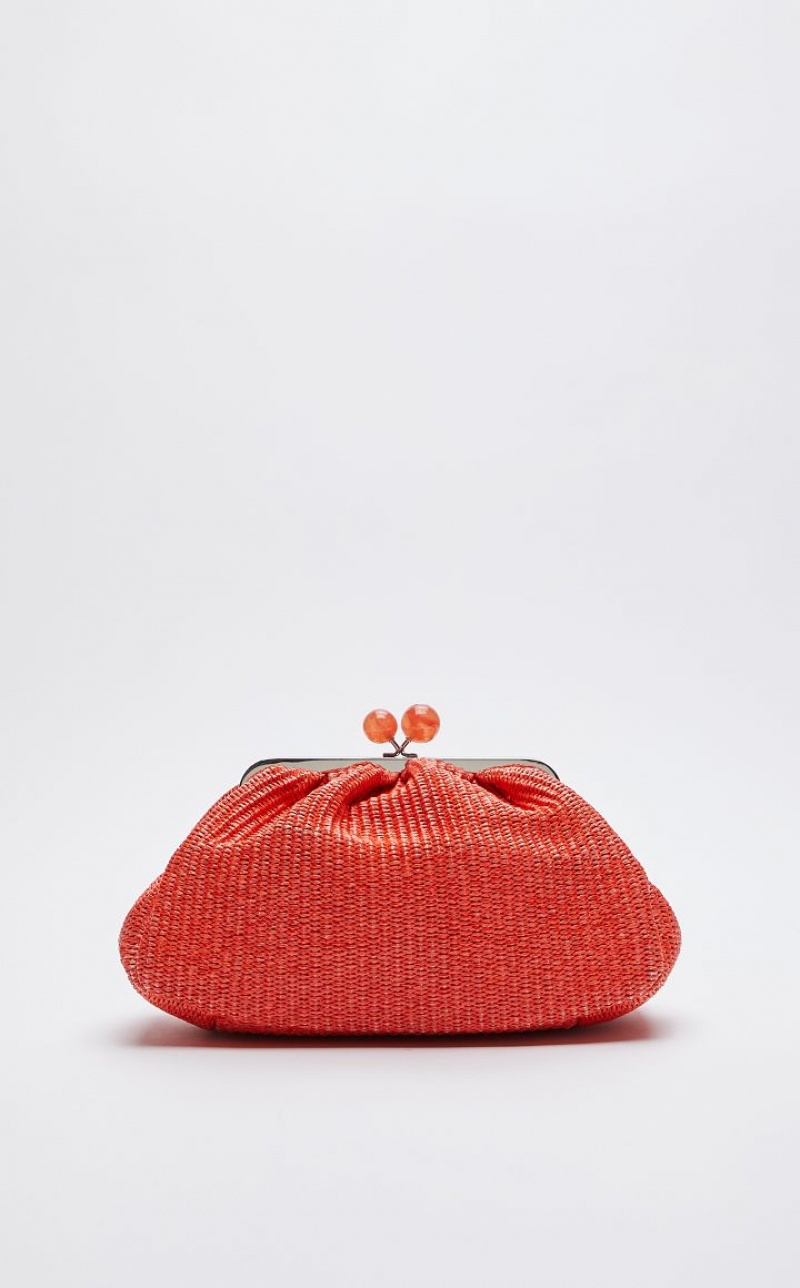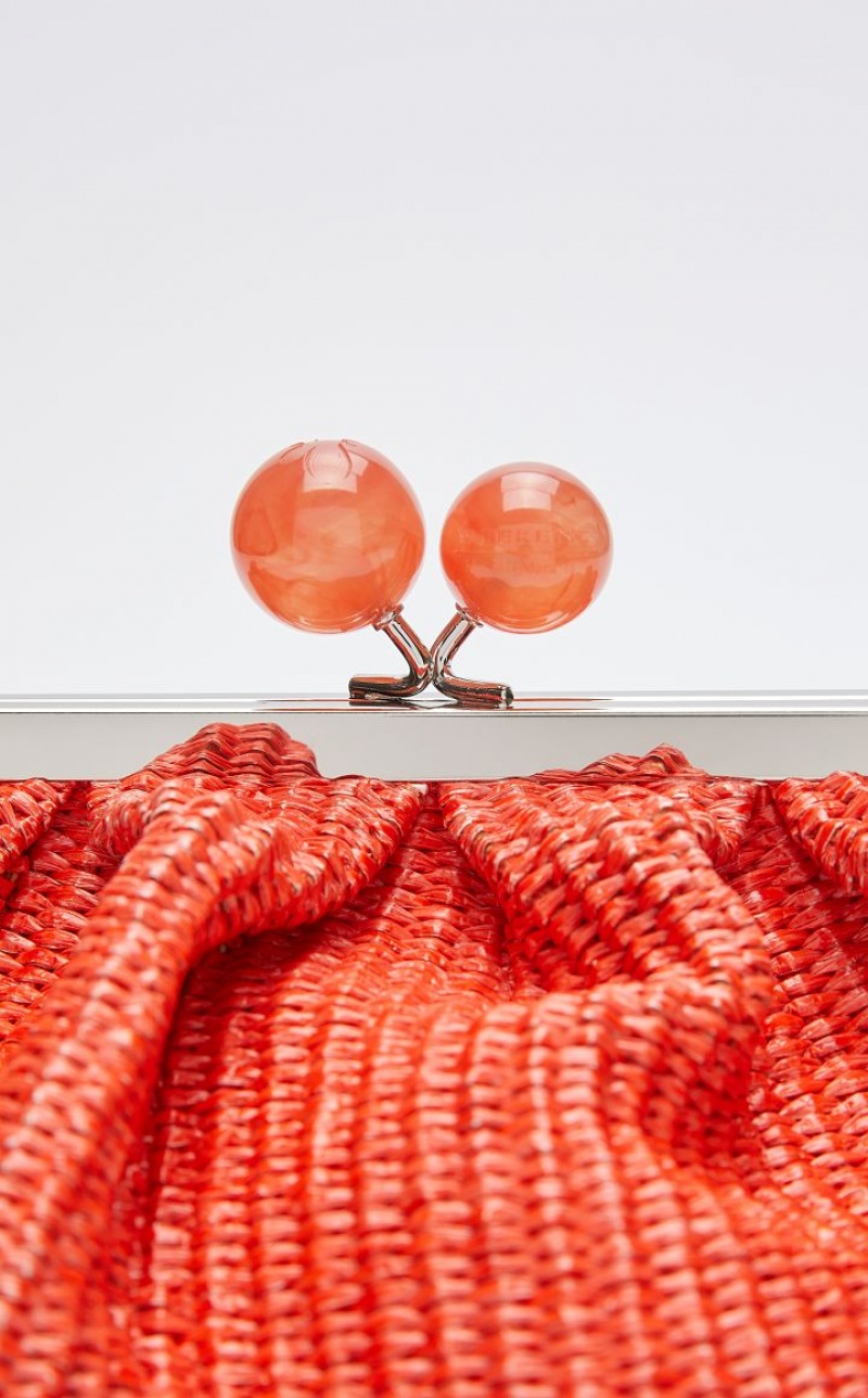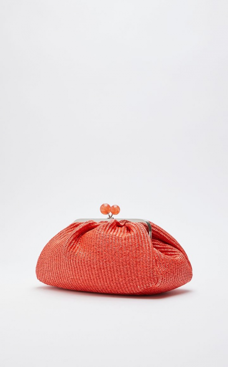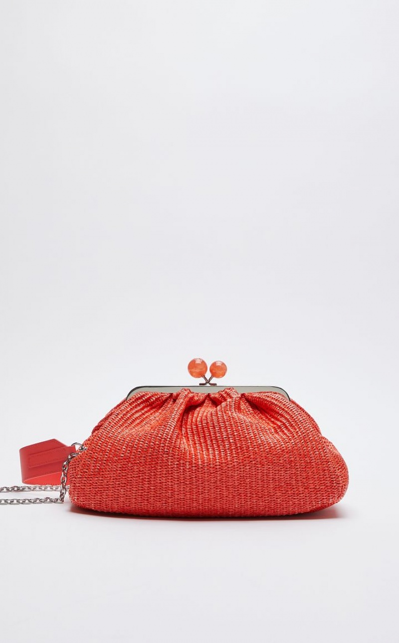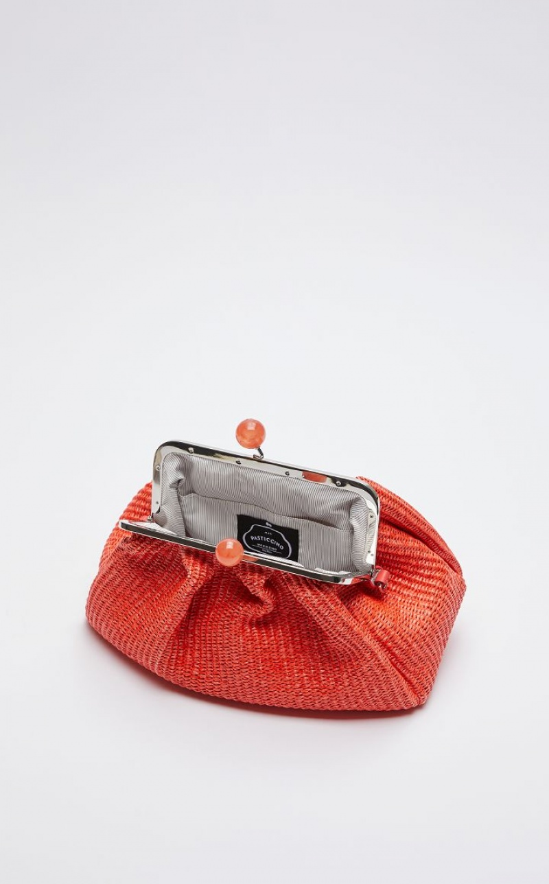 The Pasticcino Bag is the super clutch that adds a touch of personal charm to your everyday style. Medium sized Pasticcino Bag in raffia, finished with handcrafted techniques creating three dimensional colour gradient effects. With a double leather and chain shoulder strap, it can be carried on the shoulder or crossbody, for a versatile and trendy look. Interior lined with striped fabric, featuring an open pocket and custom label. Fastened with a matching opaline resin sphere, with butterfly detail and logo. Its deconstructed silhouette and deliberately oversized proportions make it perfect to meet your every need.