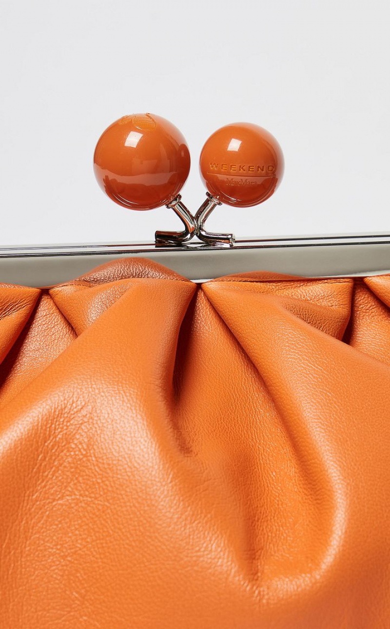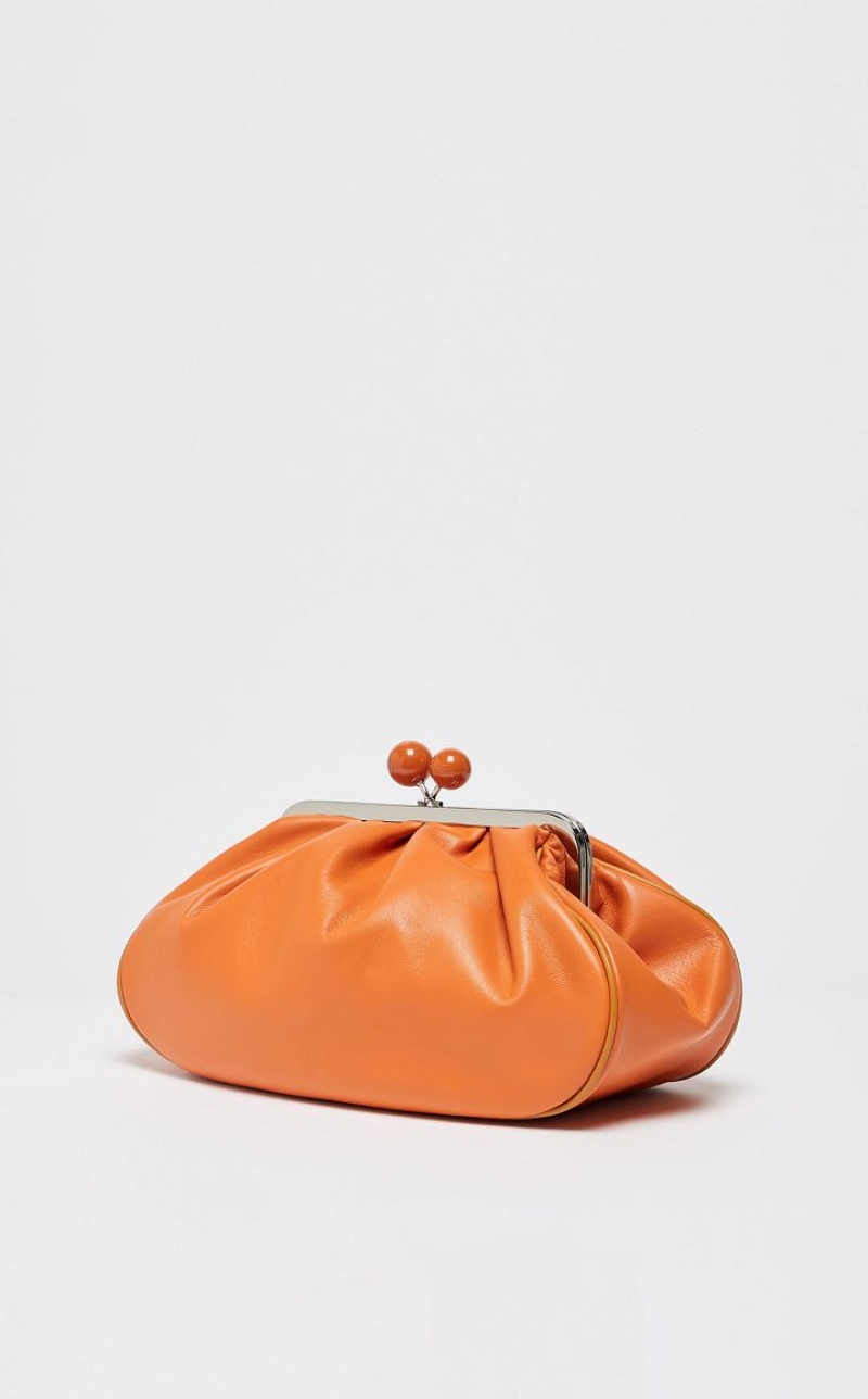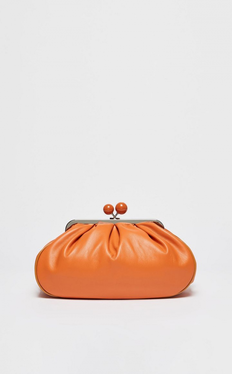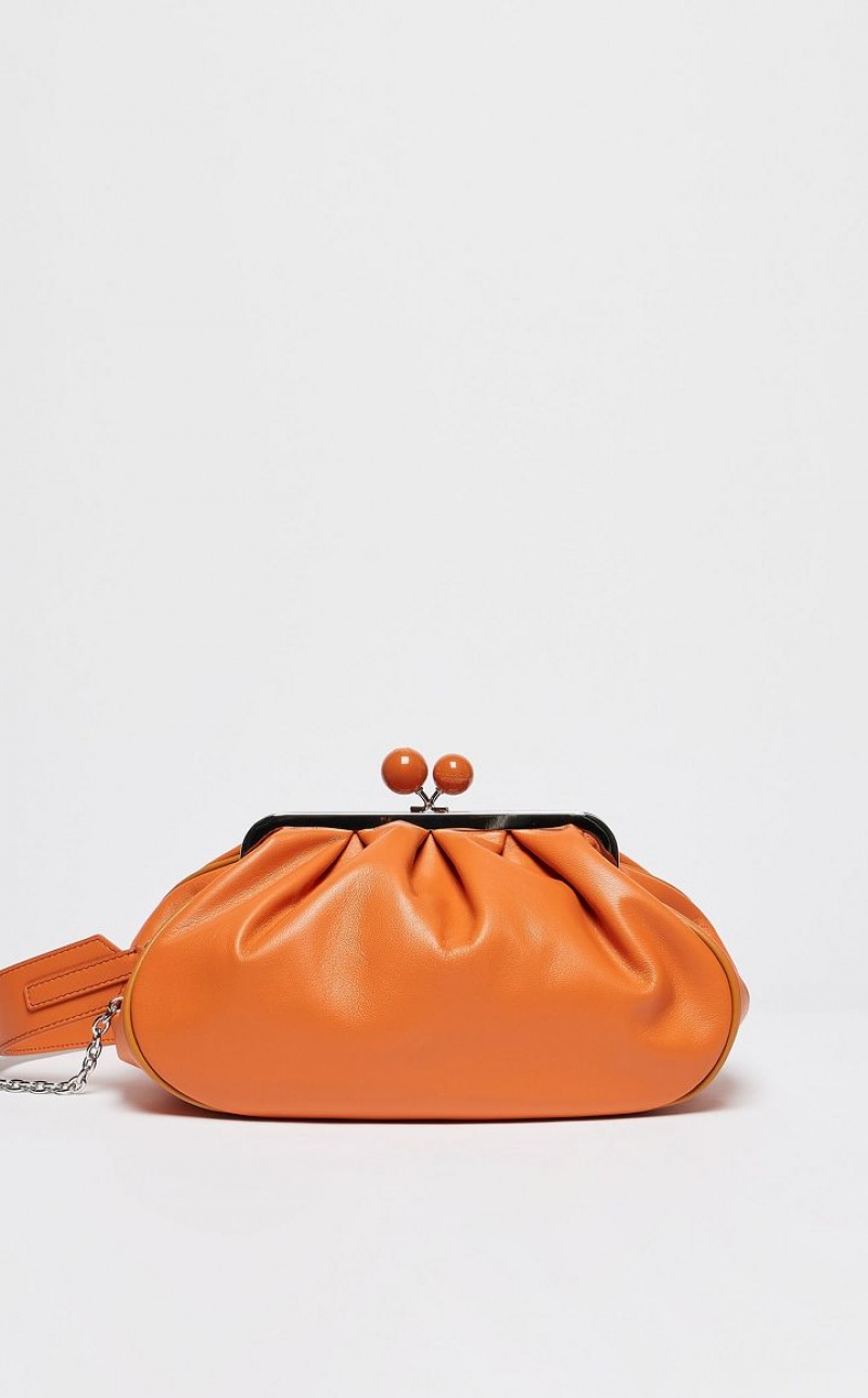 Pasticcino Bag, the super clutch that adds a touch of individuality and charm to your everyday style. Pasticcino Medium in nappa leather, finished with contrast piping that emphasises its lines. Lightly padded to enhance its soft and delicate design, which adapts to the wearer’s silhouette. The detachable double chain and leather strap makes for a versatile style: the ideal crossbody or shoulder bag to accessorise an on-trend outfit. Finished with resin spheres and a custom label on the inside. Size: 31 x 13 x 21 cm.