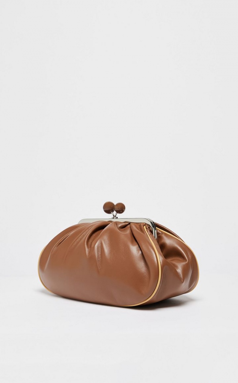 Pasticcino Bag, the super clutch that adds a touch of individuality and charm to your everyday style. Pasticcino Medium in nappa leather, finished with contrast piping that emphasises its lines. Lightly padded to enhance its soft and delicate design, which adapts to the wearer’s silhouette. The detachable double chain and leather strap makes for a versatile style: the ideal crossbody or shoulder bag to accessorise an on-trend outfit. Finished with resin spheres and a custom label on the inside. Size: 31 x 13 x 21 cm.