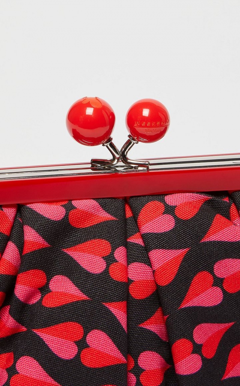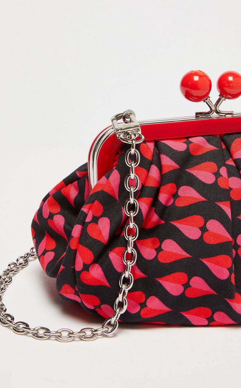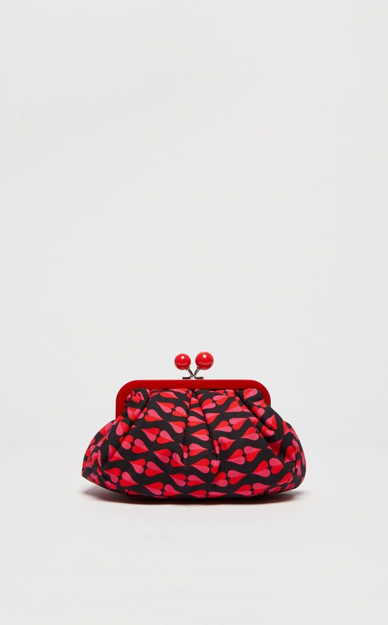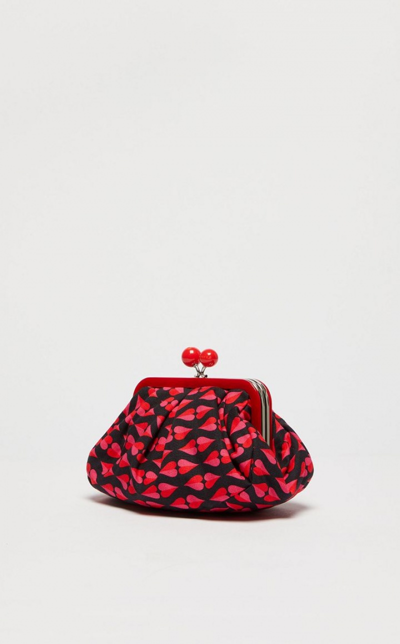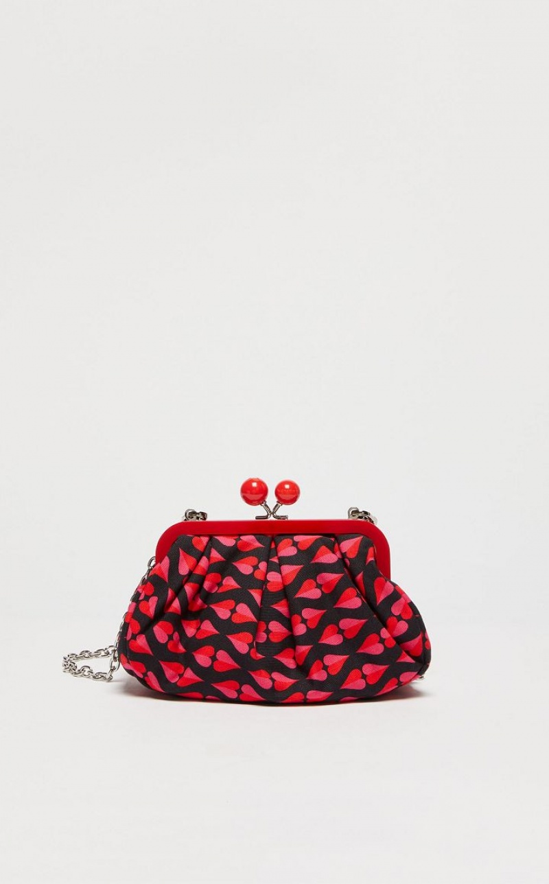 The Small Pasticcino Bag is the super clutch that adds a touch of personal charm to your everyday style. Made of printed canvas, with lined interior and red resin zips. The detachable chain strap with leather detail makes for a versatile style: wear it as a crossbody or handbag to accessorise an on trend outfit. Finished with matching resin spheres and custom label on the inside. Its deconstructed silhouette and deliberately oversized proportions make it perfect to meet your every need. Dimensions: 19 x 10 x 15 cm.