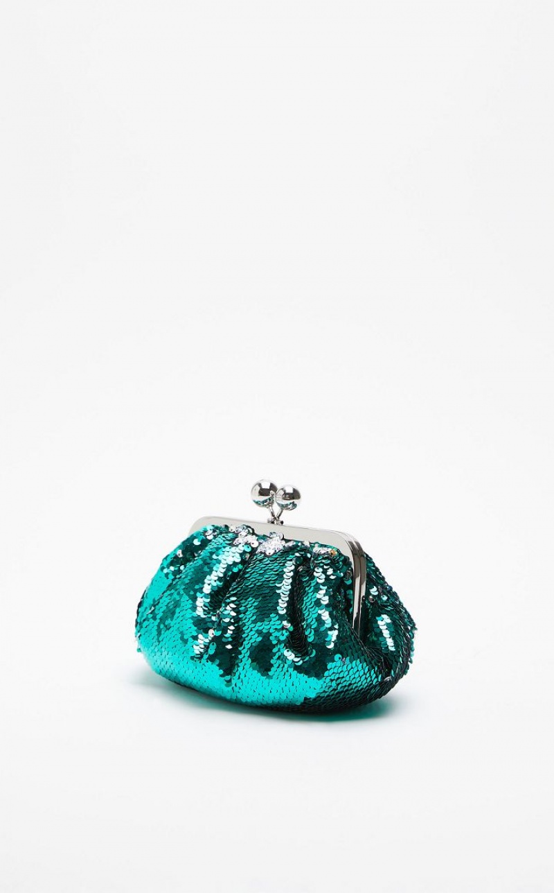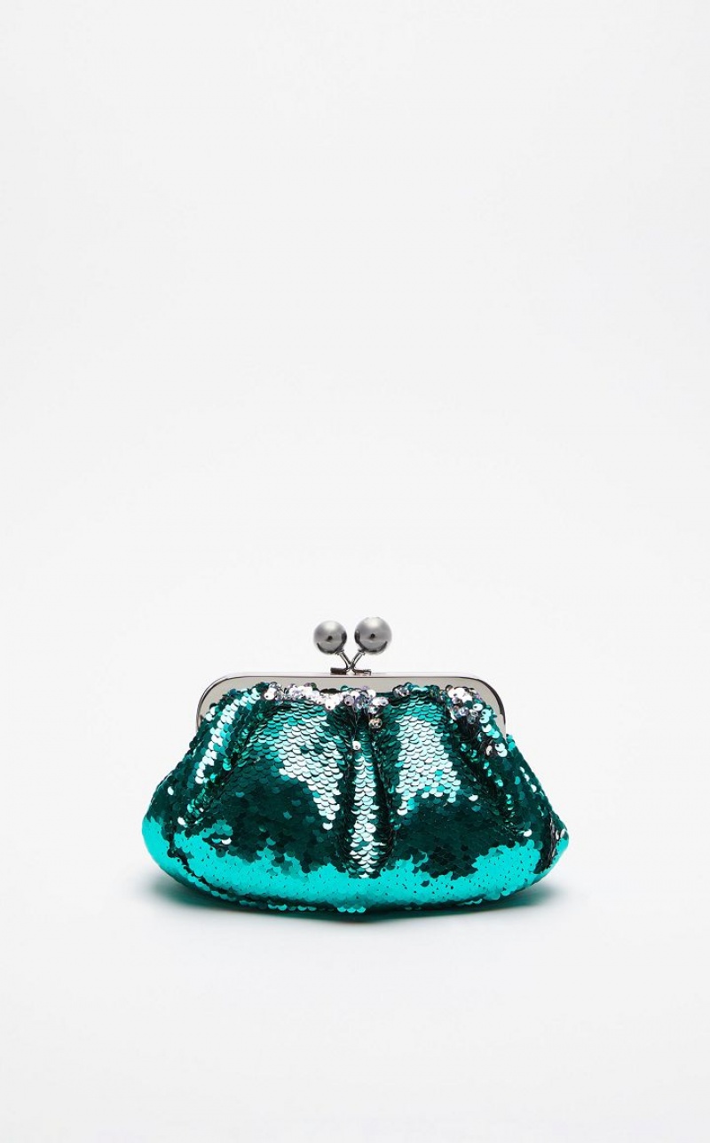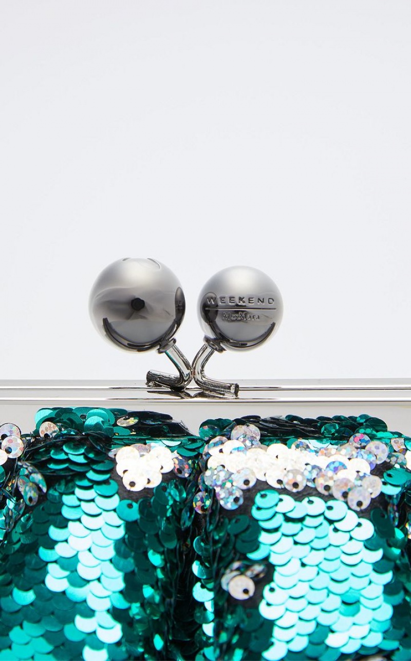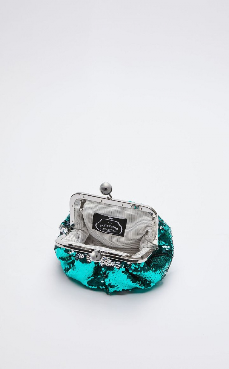 The Pasticcino Bag is the super clutch that adds a touch of personal charm to your everyday style. Pasticcino Small in technical fabric, entirely embroidered with two-tone sequins whose colour changes depending on their direction. Lightly padded to enhance its soft and delicate design, which adapts to the wearer’s silhouette. The detachable double chain and leather strap makes for a versatile style: the ideal crossbody or shoulder bag to accessorise an on-trend outfit. Finished with resin spheres and a custom label on the inside. Size: 19 x 10 x 15 cm.