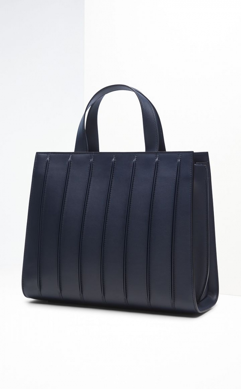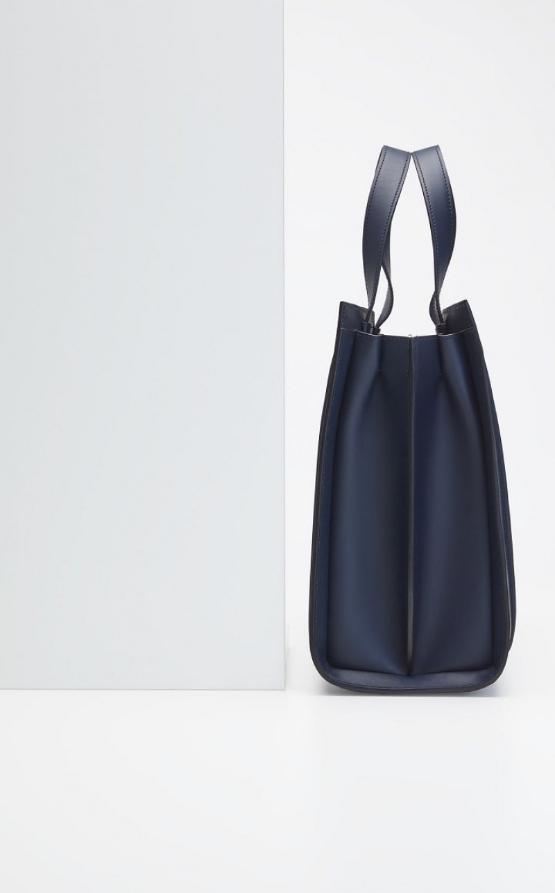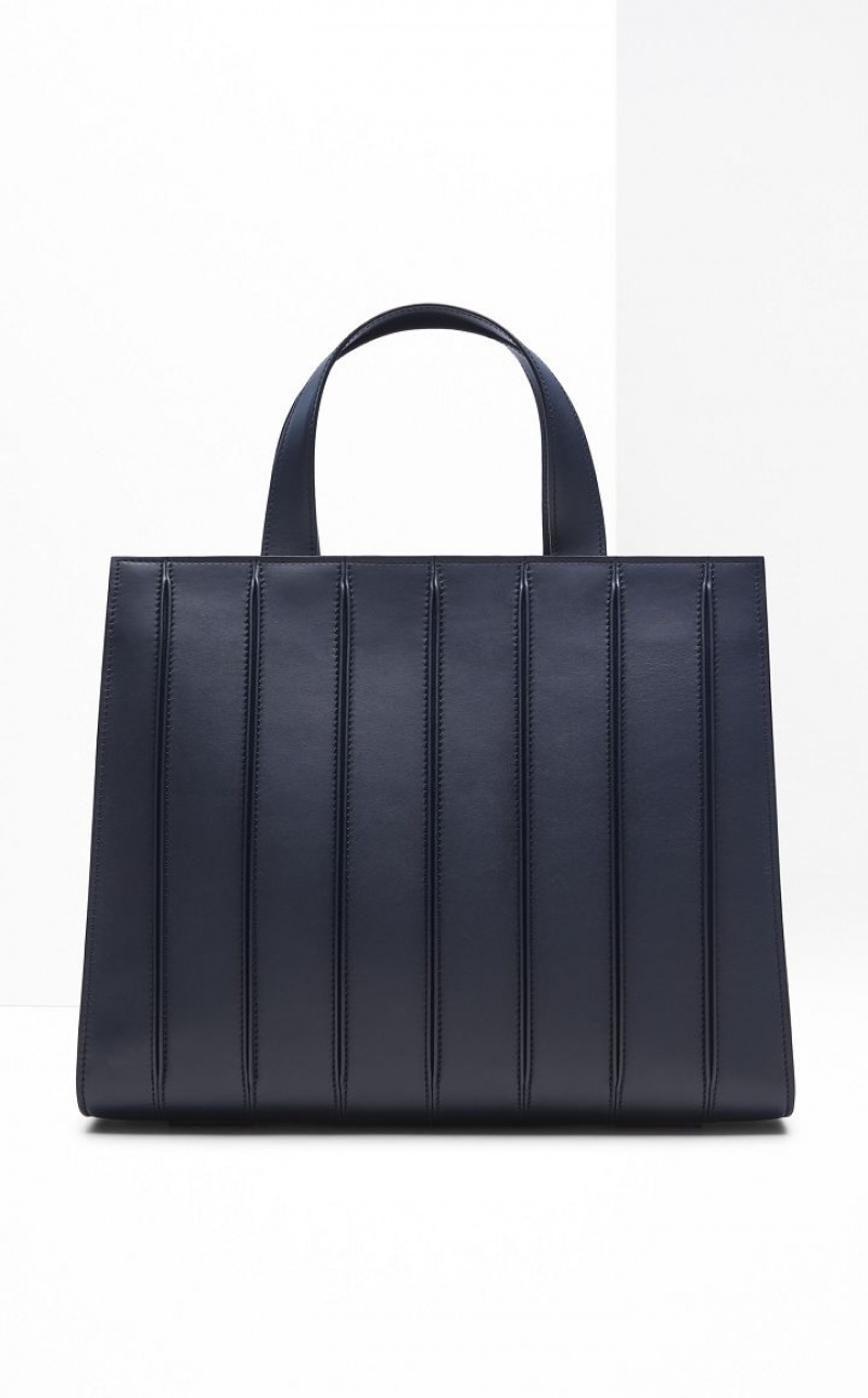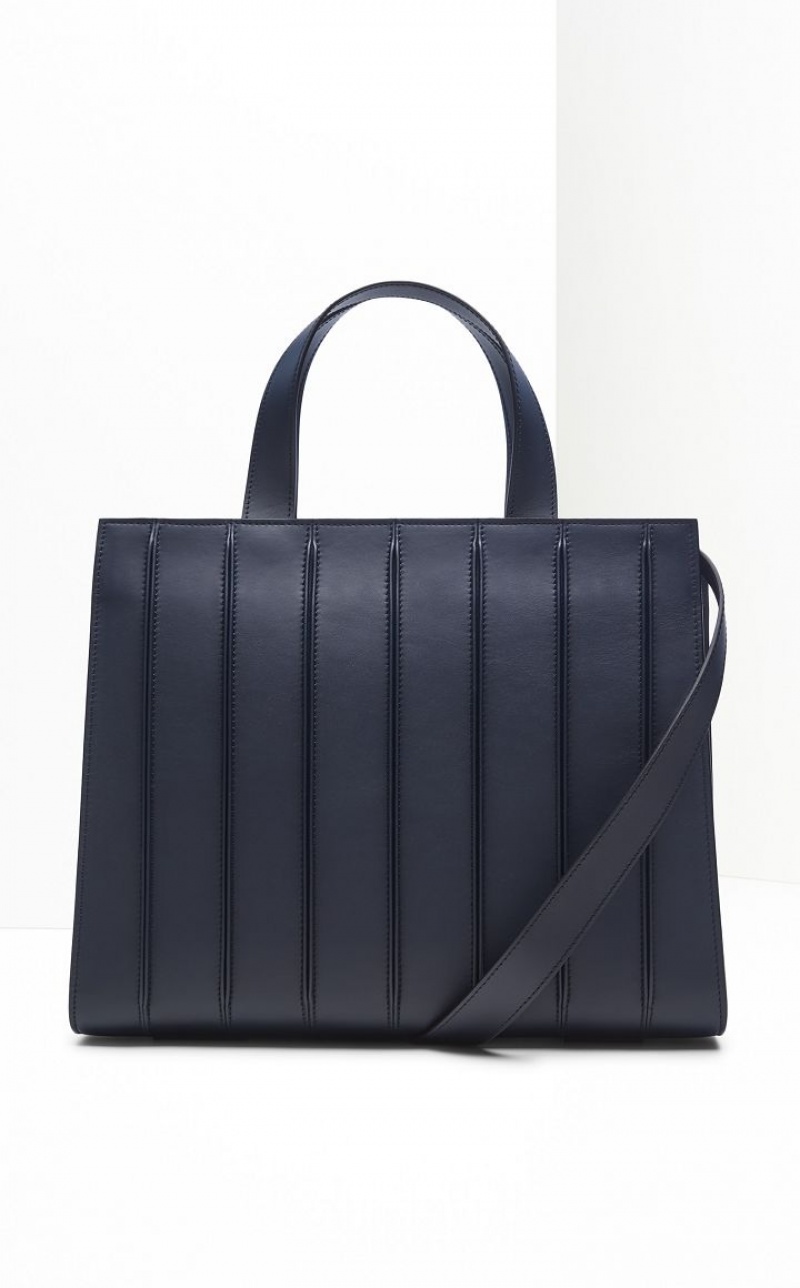 Medium Whitney Bag made of soft, smooth leather, featuring double handles and a detachable, adjustable strap. Plated metallic details. A divider separates two zipped inner compartments lined in microfibre with a soft texture.