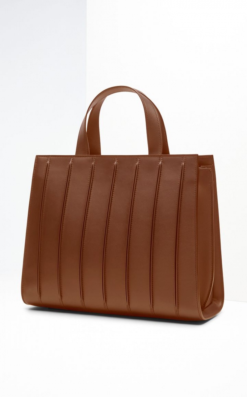 Medium Whitney Bag made of soft, smooth leather, featuring double handles and a detachable, adjustable strap. Plated metallic details. A divider separates two zipped inner compartments lined in microfibre with a soft texture.