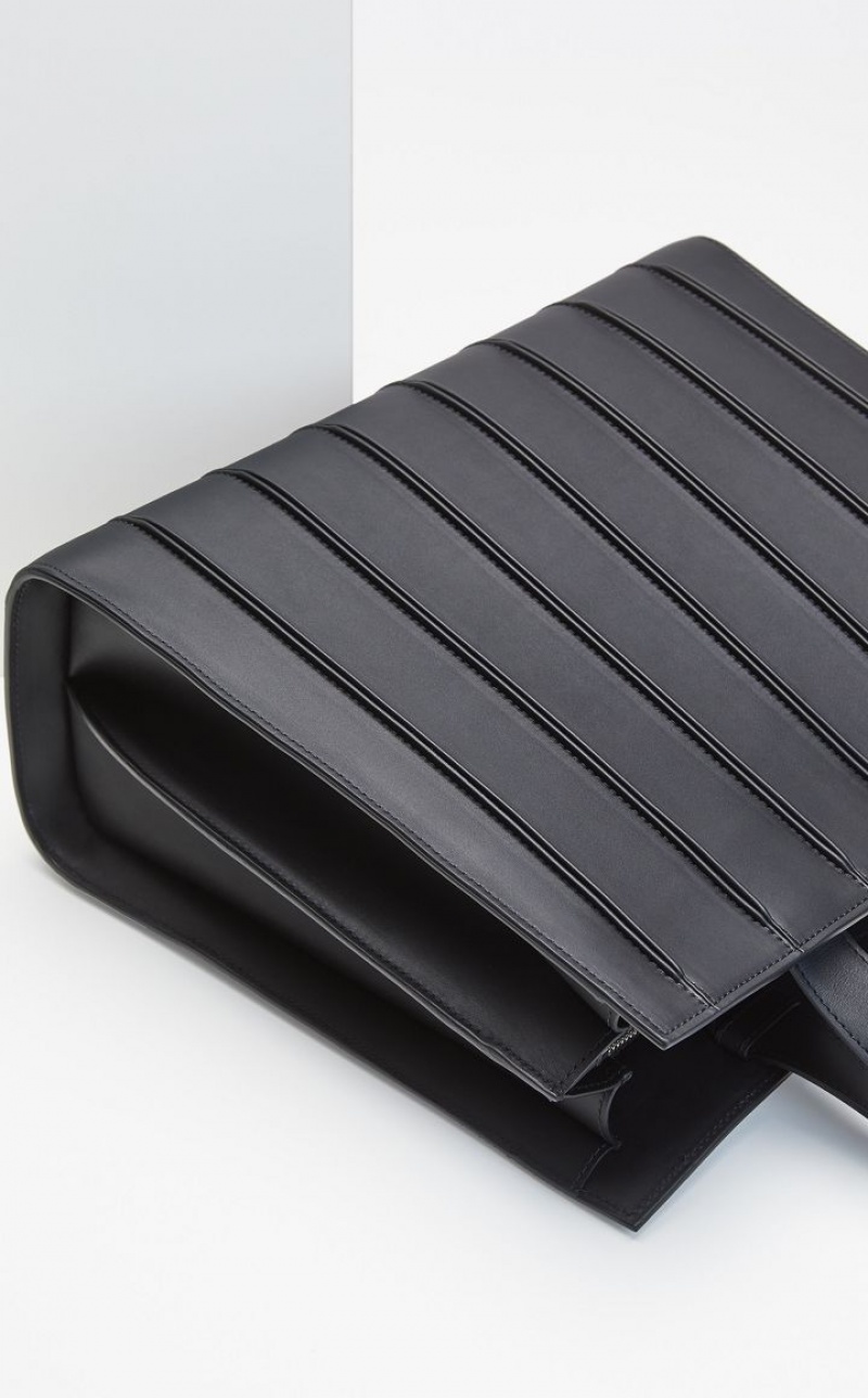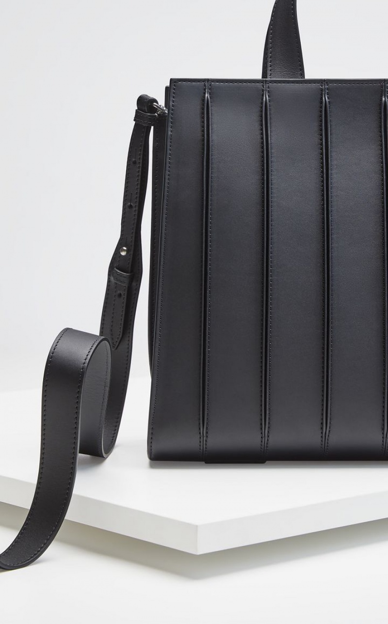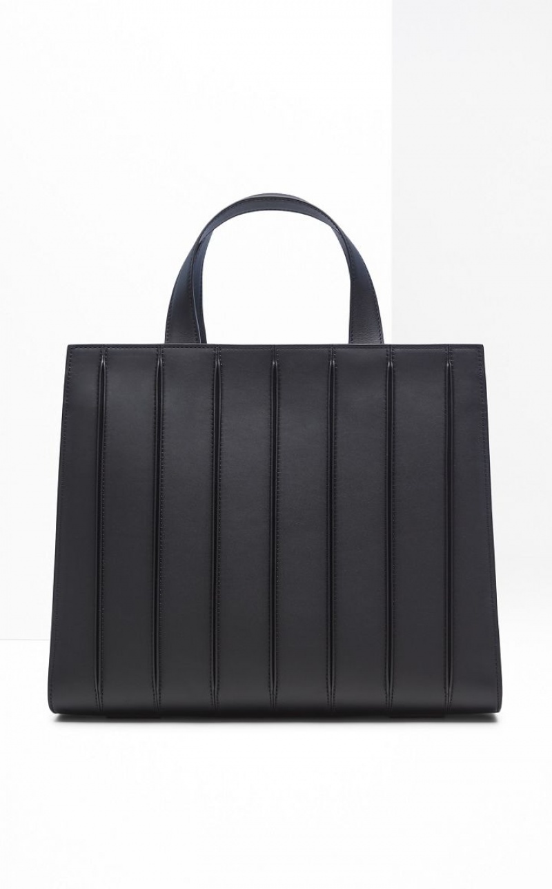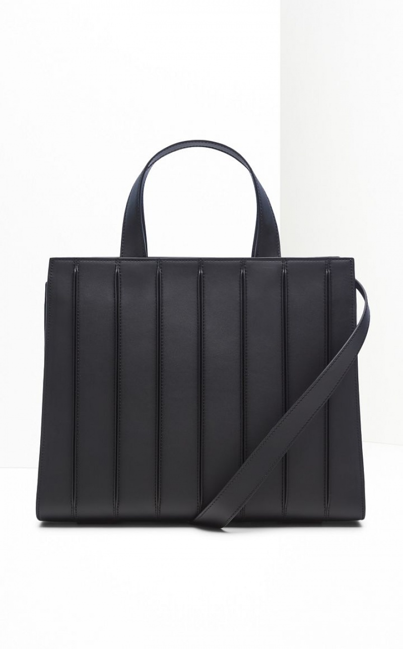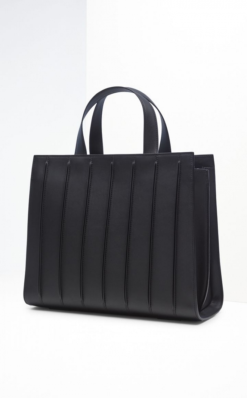 Medium Whitney Bag made of soft, smooth leather, featuring double handles and a detachable, adjustable strap. Plated metallic details. A divider separates two zipped inner compartments lined in microfibre with a soft texture.