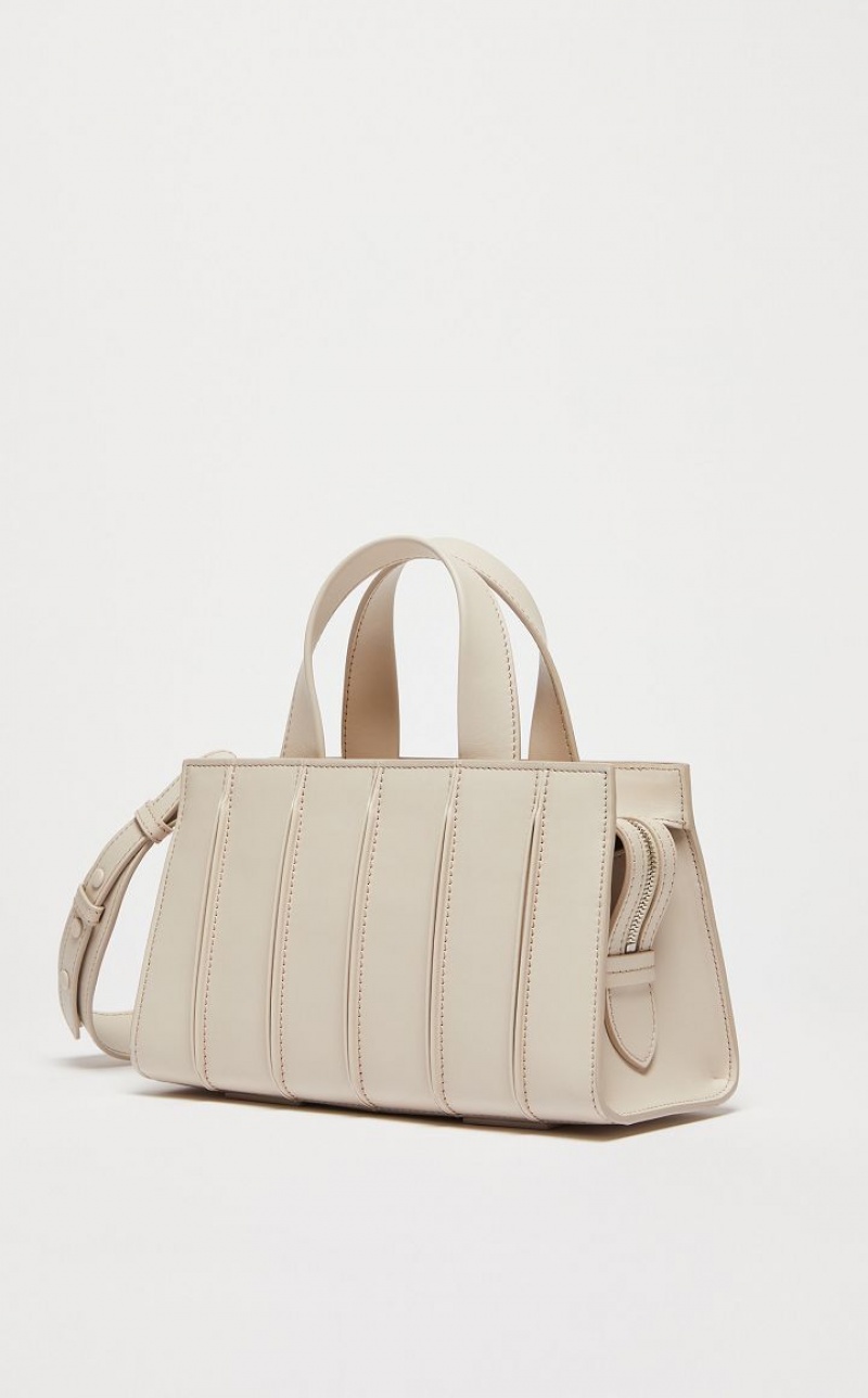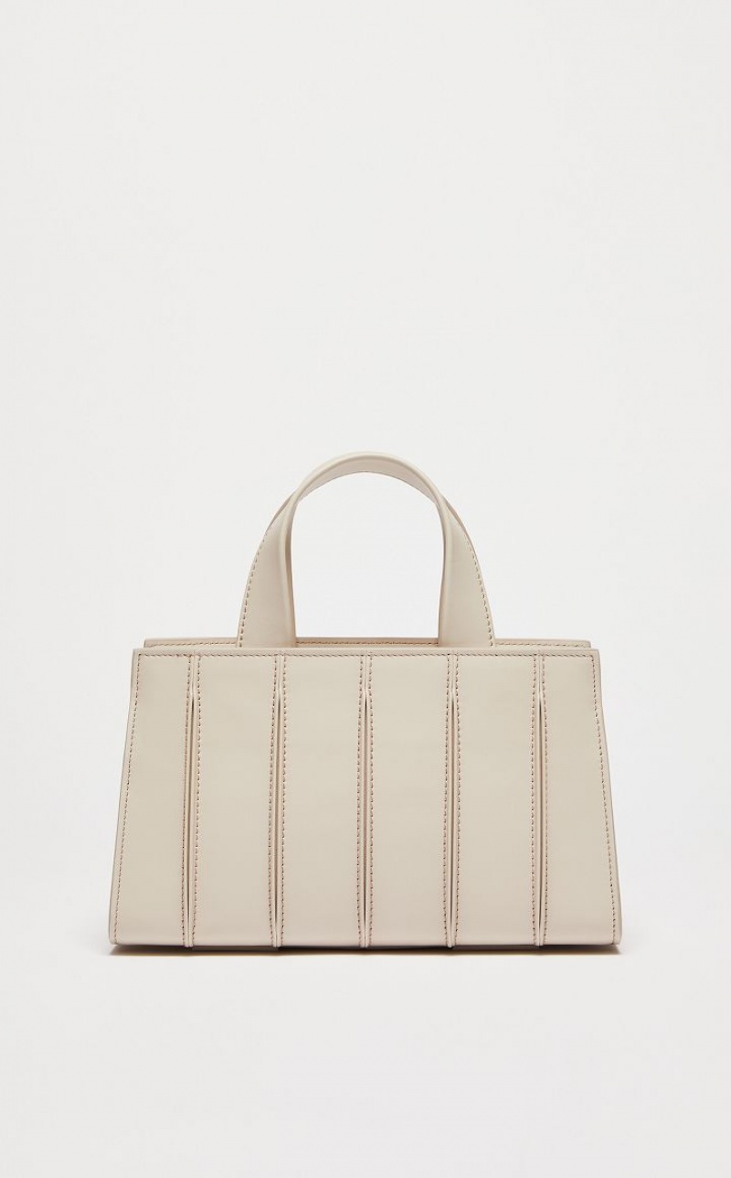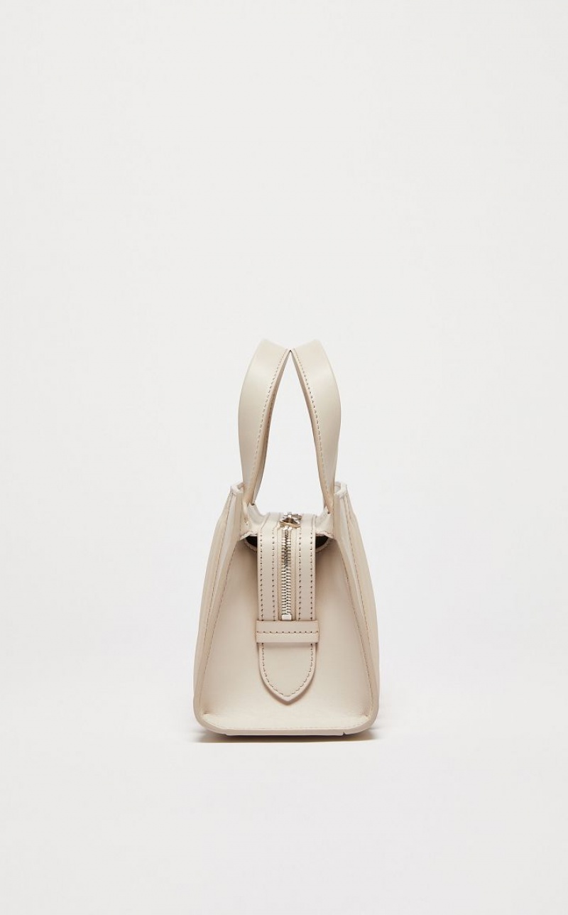Whitney Bag made of soft, smooth leather, featuring double handles and a detachable, adjustable strap. Plated metallic details. A divider separates two zipped inner compartments lined in microfibre with a soft texture. Measurements: 26 x 12 x 15 cm.