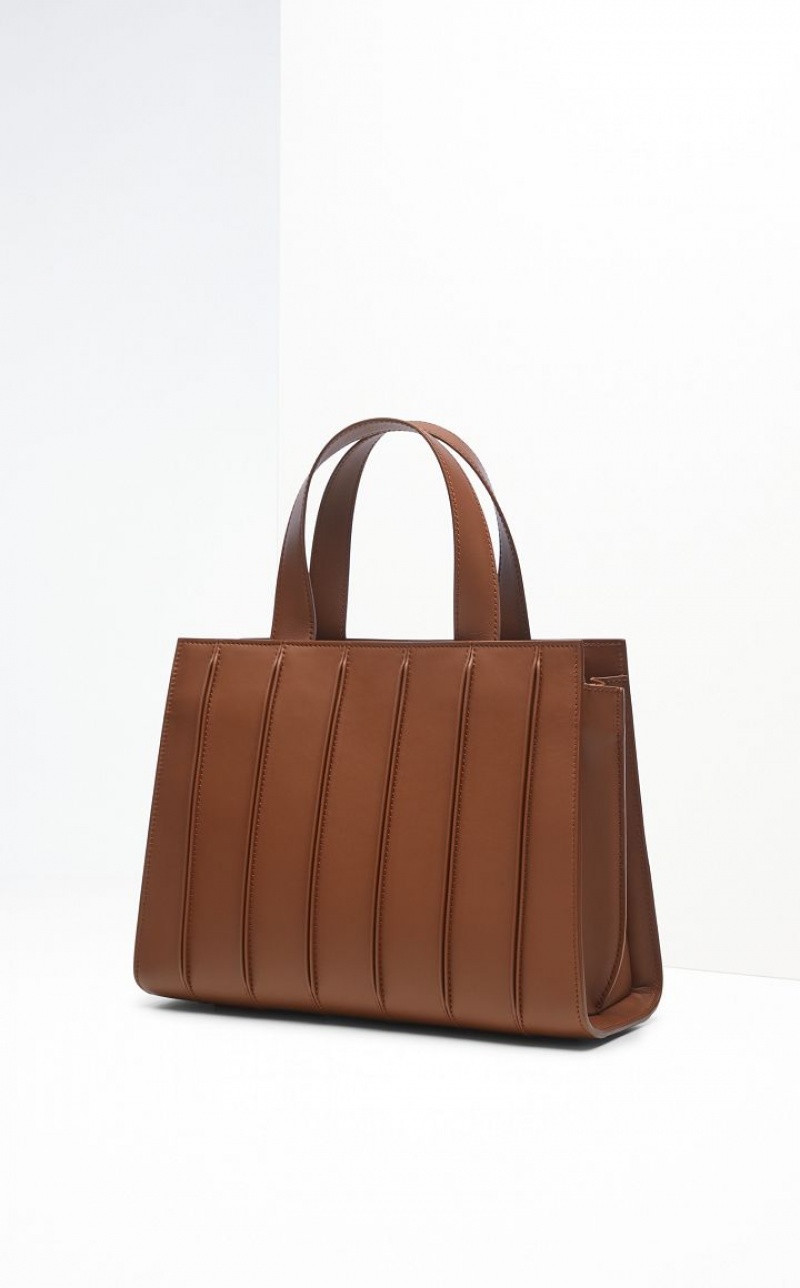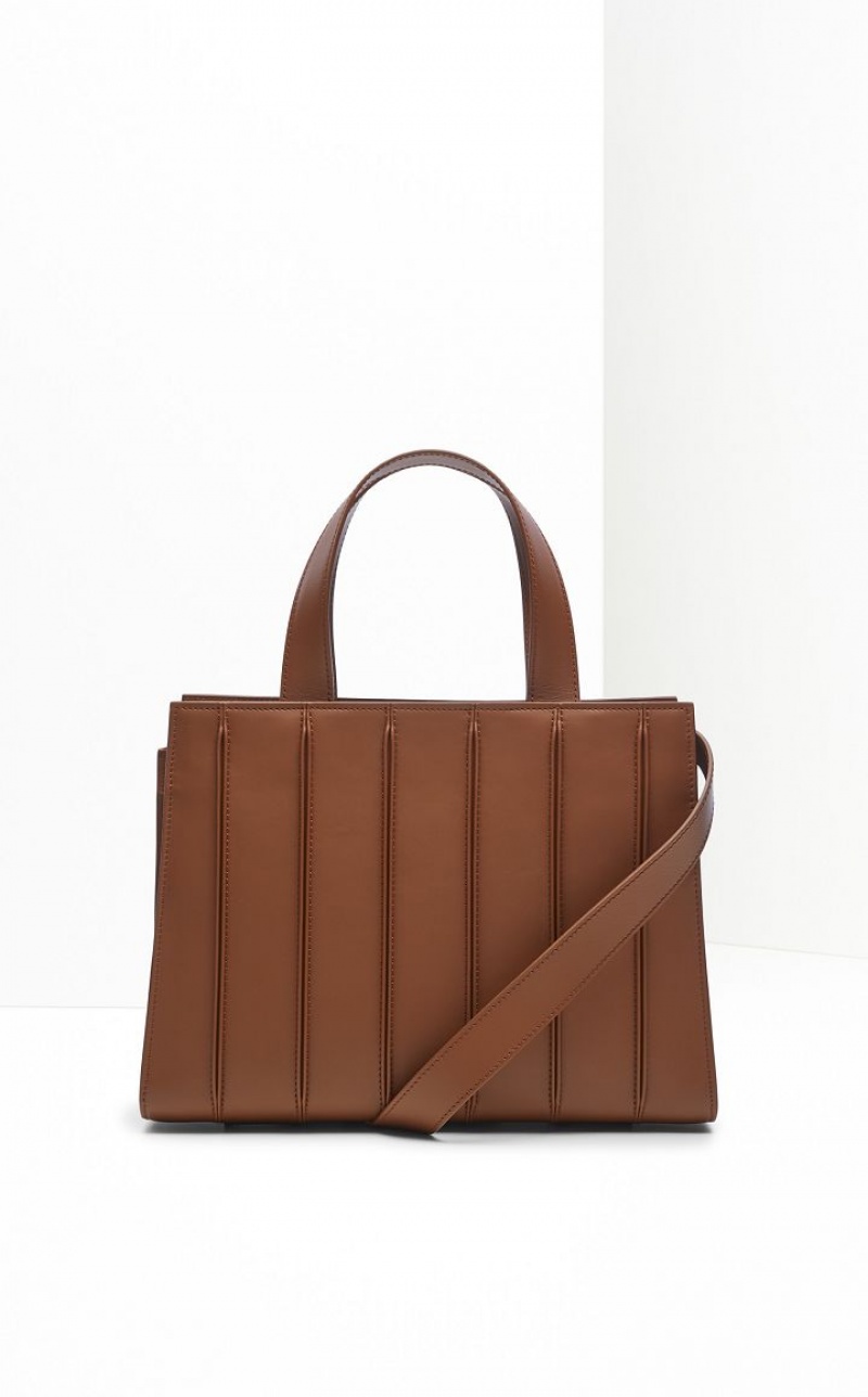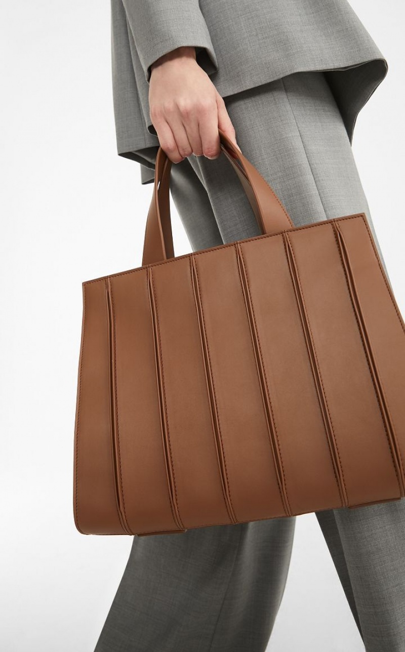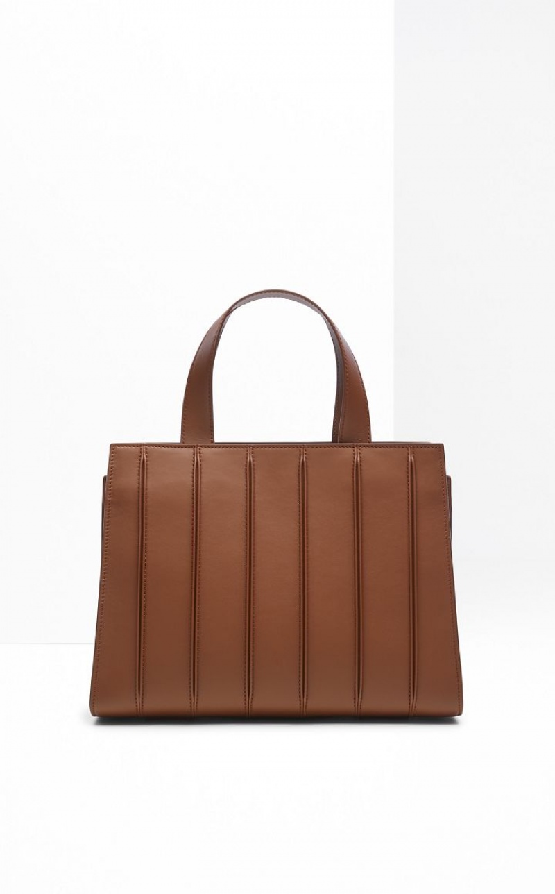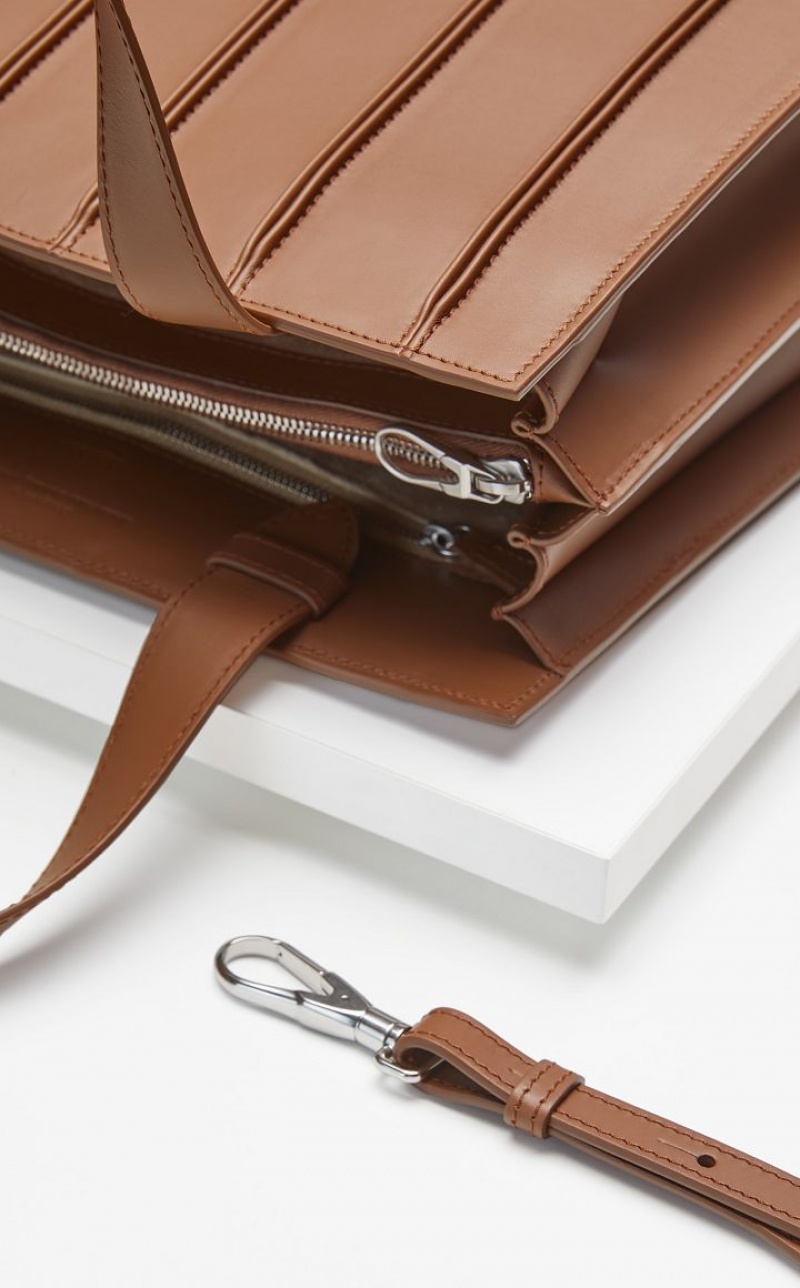 Medium Whitney Bag made of soft, smooth leather, featuring double handles and a detachable, adjustable strap. Plated metallic details. A divider separates two zipped inner compartments lined in microfibre with a soft texture. Measurements: 32.5 x 12.5 x 25 cm.