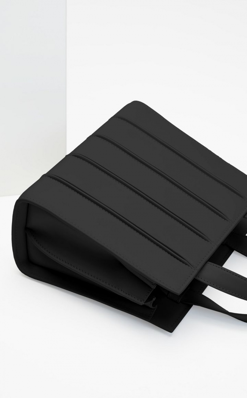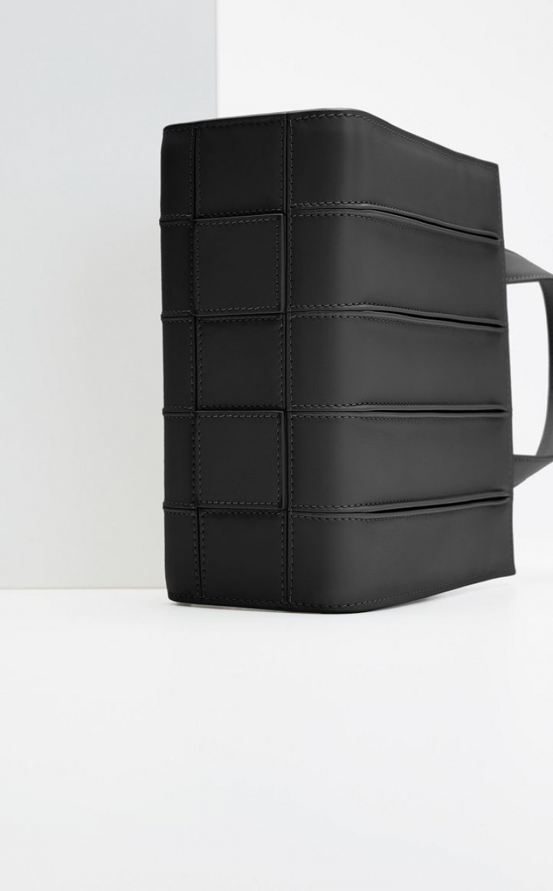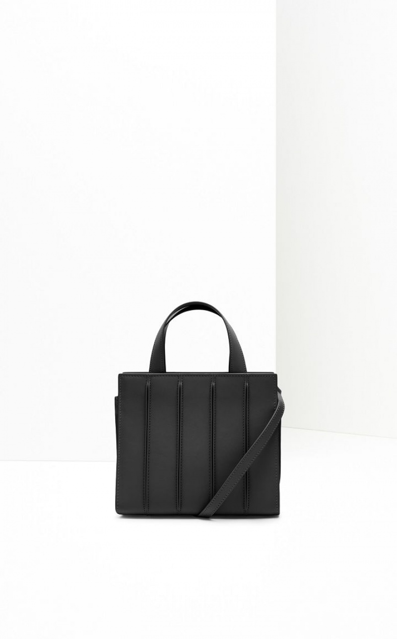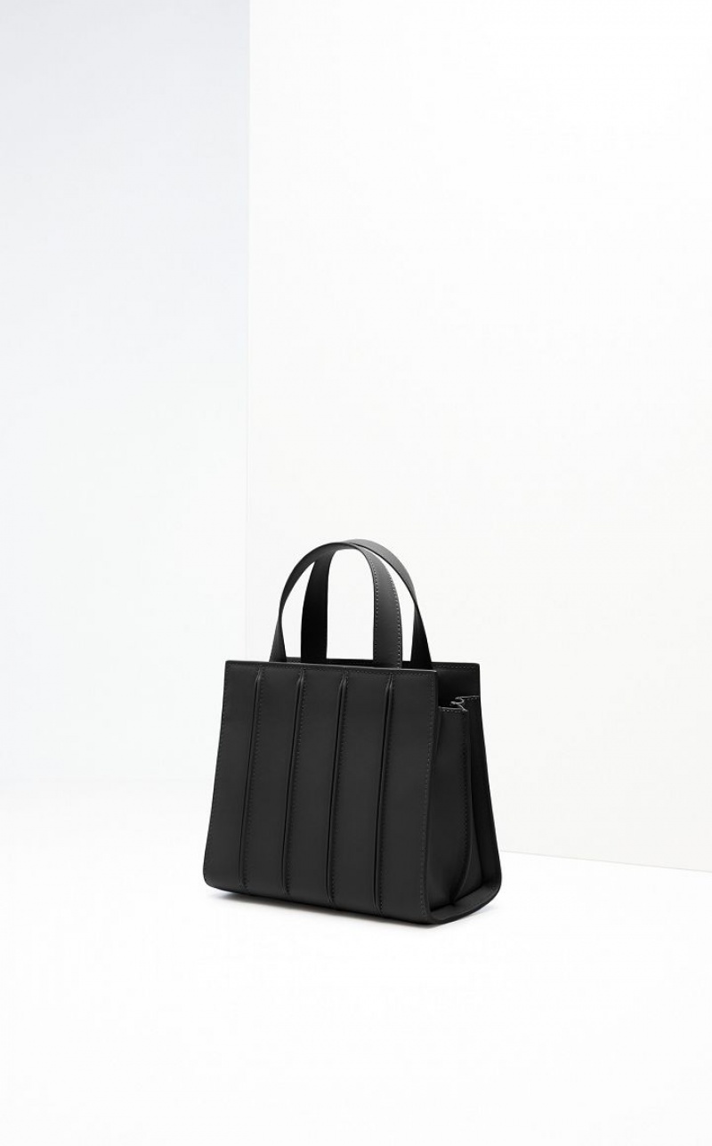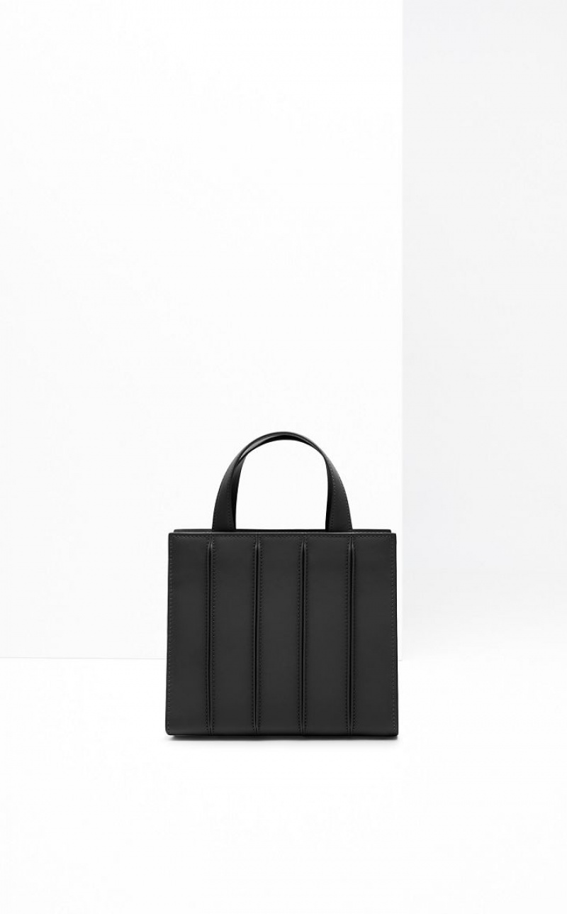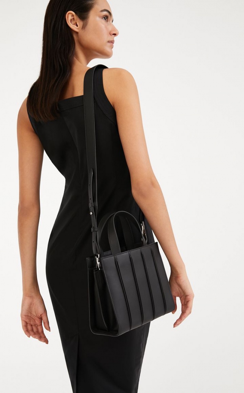 Small Whitney Bag made of soft, smooth leather, featuring double handles and a detachable, adjustable strap. Plated metallic details. A divider separates two zipped inner compartments lined in microfibre with a soft texture. Measurements: 24 x 11 x 24 cm.